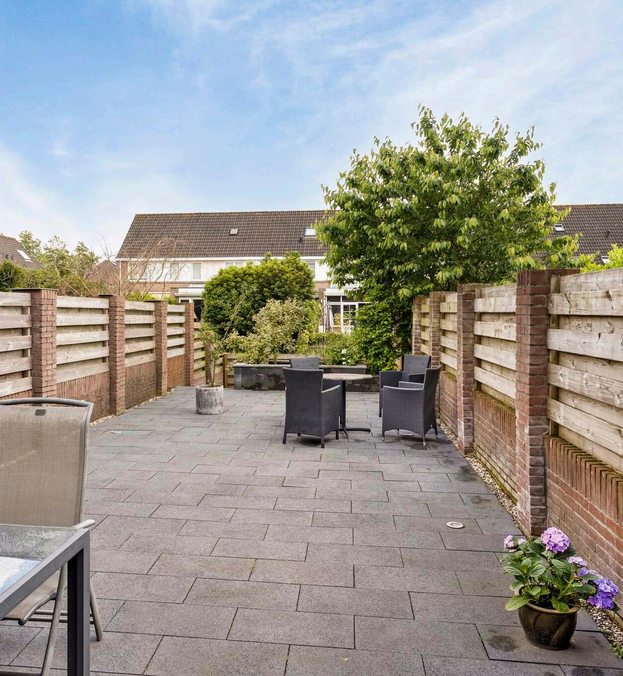 Een van de hoogtepunten van de tuin is het terras aan het water. Dit biedt een serene en schilderachtige setting, ideaal voor het genieten van een kopje koffie in de ochtend of een glas wijn in de avond. De tuin is volledig bestraat met luxe grote tegels, wat zorgt voor een strakke en moderne uitstraling.