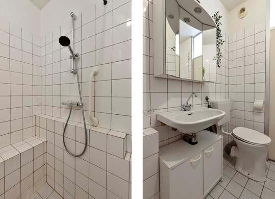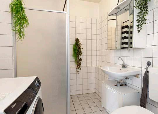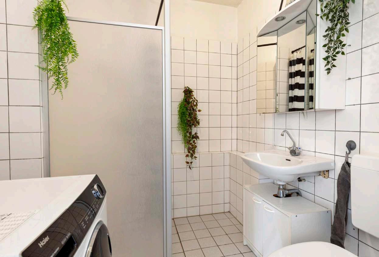 De badkamer is functioneel ingericht met een douche, wastafel en toilet. Daarnaast bevindt zich hier de aansluiting voor de wasmachine, wat zorgt voor een efficiënte indeling van de woning.