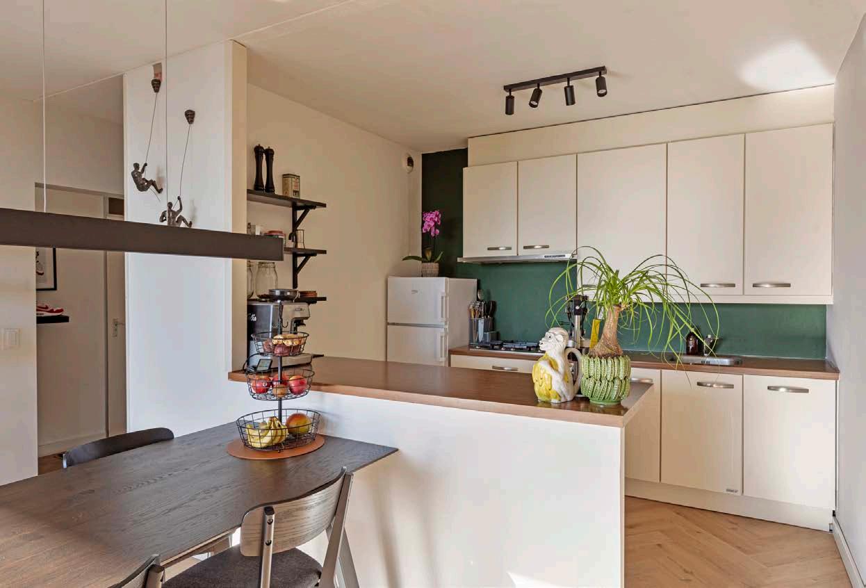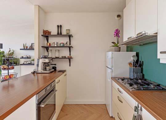 De keuken is onderdeel van de woonkamer en uitgevoerd in een rechte opstelling. Deze biedt voldoende werkruimte en opbergmogelijkheden. Door de open verbinding met de woonkamer blijft er contact met de leefruimte, wat praktisch is in het dagelijks gebruik. Er is ruimte om een kleine bar of extra zitplek te creëren.
