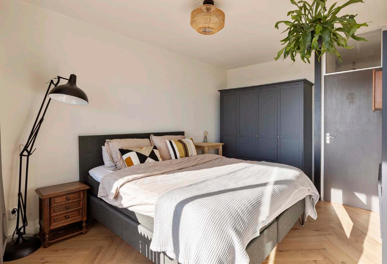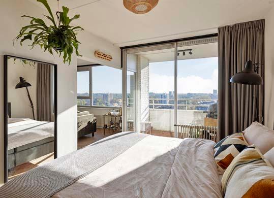 De slaapkamer is ruim genoeg voor een tweepersoonsbed en een kast. Via de schuifpui heb je direct toegang tot het balkon. Dit zorgt voor extra lichtinval en maakt het eenvoudig om even naar buiten te gaan.