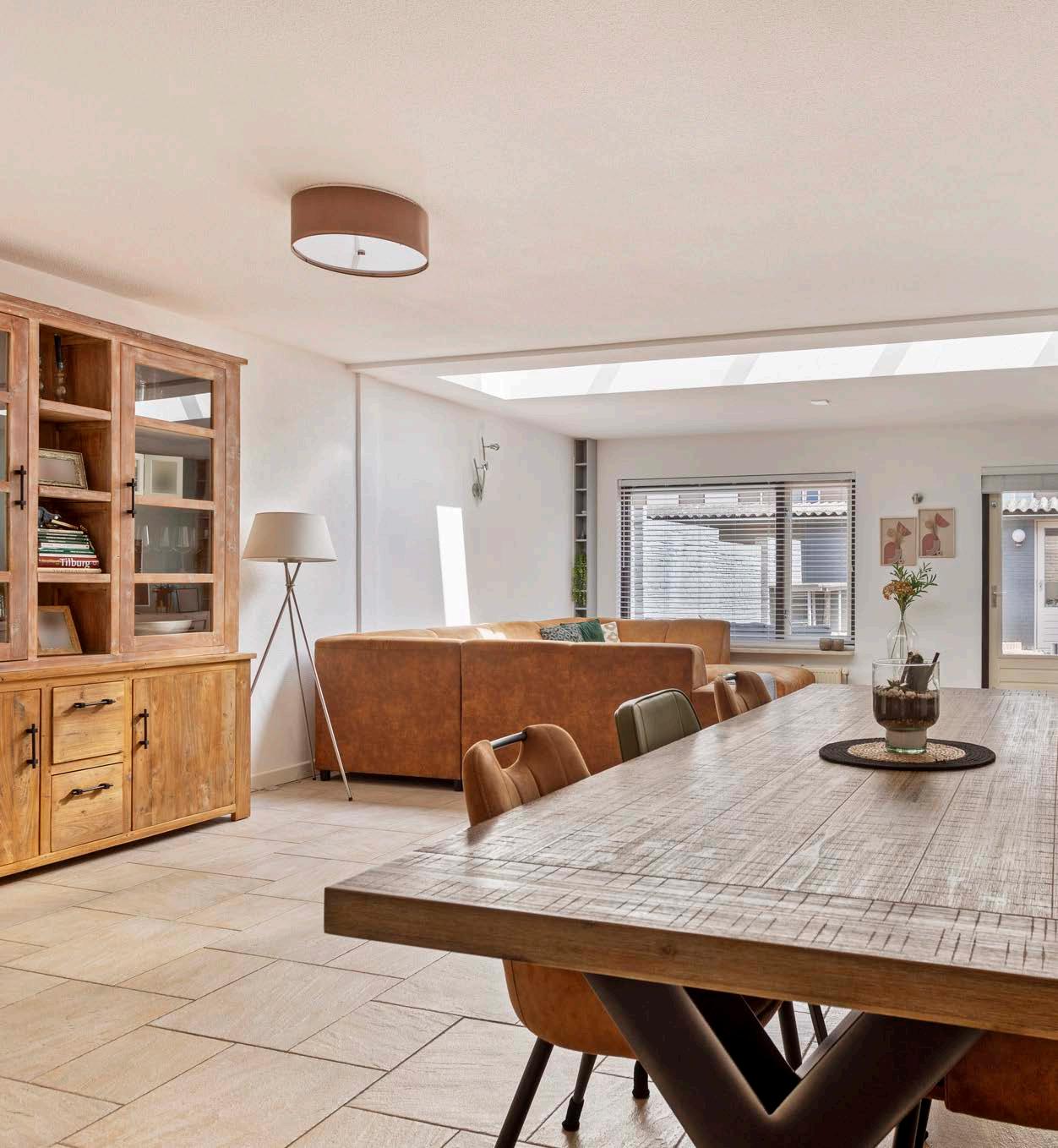 De grote aanbouw aan de achterzijde van het huis met een indrukwekkende lichtstraat zorgt voor een overvloed aan natuurlijk licht. Dit ontwerp zorgt ervoor dat de leefruimte baadt in zonlicht, wat een warme en uitnodigende sfeer creëert. Ideaal voor gezellige familiemomenten of het ontvangen van gasten. Hier kun je ontspannen met een goed boek, genieten van een kop koffie of samen met het gezin de dag plannen.