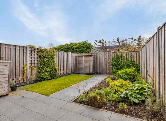 Aan de achterzijde van de tuin bevindt zich een handige kleine houten bergkast, ideaal voor het opbergen van tuingereedschap en buitenaccessoires. De achterom biedt gemakkelijke toegang tot de tuin, wat bijzonder handig is voor het binnenbrengen van fietsen of tuinafval.
