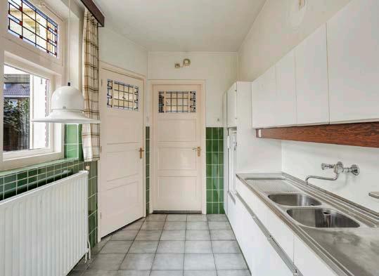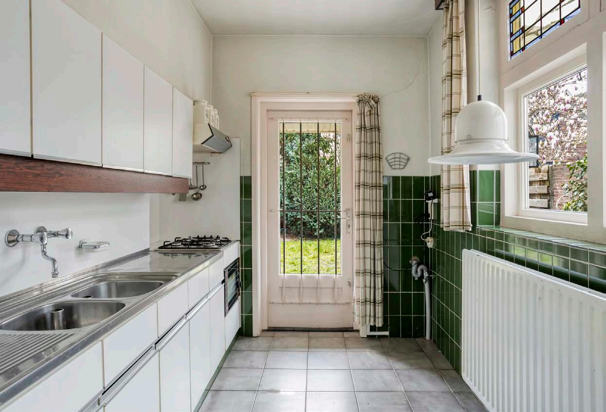 Aangrenzend bevindt zich de keuken, functioneel ingericht en met directe toegang tot de tuin. Dit is een plek waar koken en samenkomen samenkomen. De huidige keuken biedt alle basisvoorzieningen, maar nodigt tegelijkertijd uit tot modernisering. Dit is jouw kans om een eigentijdse leefkeuken te creëren die volledig aansluit bij jouw woonwensen.