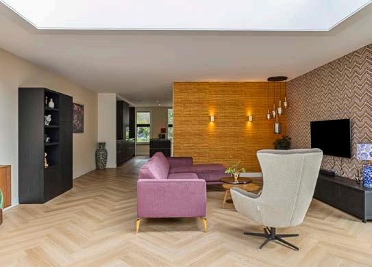 De woonkamer is erg ruim en licht dankzij de grote ramen en de prachtige lichtkoepel. De vloer, die is voorzien van een visgraat-pvc, zorgt voor een warme, chique uitstraling. Hier kan je gezellig tijd doorbrengen met vrienden en familie.
