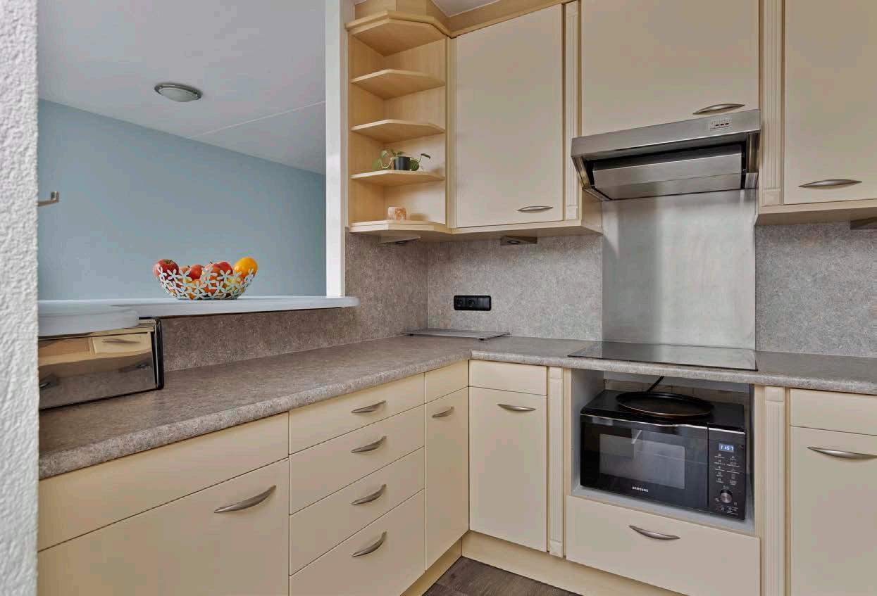 De woning is voorzien van een ruime open keuken geplaatst in een u opstelling waardoor je meer dan voldoende werk, - en opbergruimte hebt.