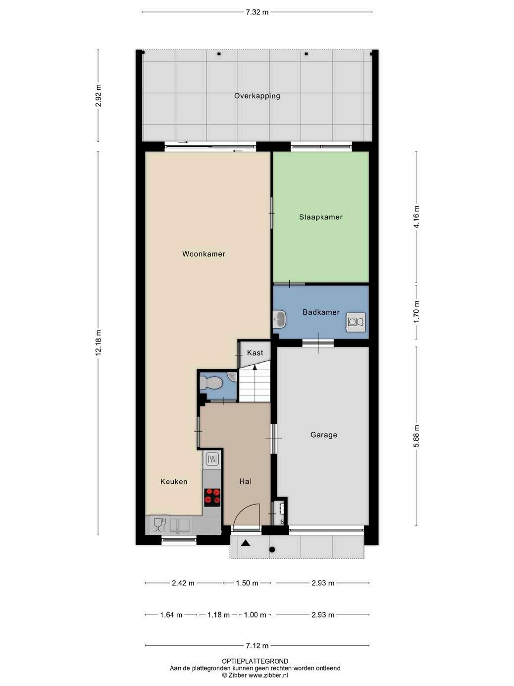 De tuingerichte woonkamer is aangenaam licht door het hoge raam en de glazen schuifpui naar buiten. Het geheel is verzorgd afgewerkt, bestaande uit een tegelvloer inclusief vloerverwarming en strak stucwerk op de wanden. Zoals is afgebeeld op de optie-plattegrond biedt de woonkamer de mogelijkheid om een slaapkamer en badkamer op de begane grond te realiseren.