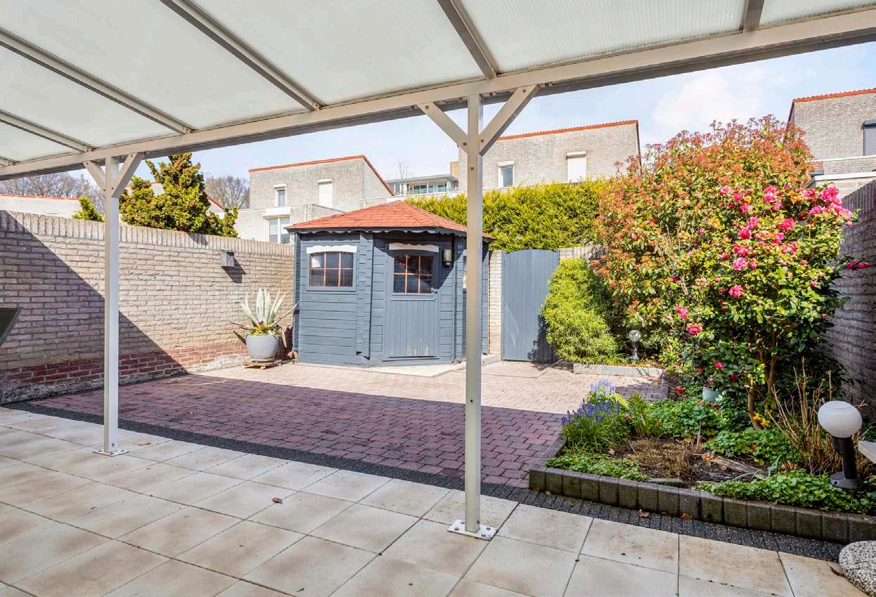 Achter de woning ligt een nette tuin met noordoostelijke ligging. Het geheel is verzorgd aangelegd met bestrating, borders, overkapping en een houten tuinhuis. Vervolgens biedt ook de eigen achterom toegang tot de tuin.