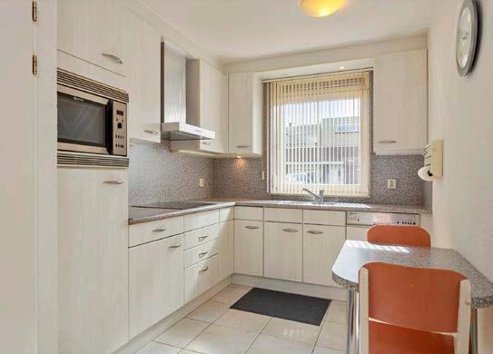 Aan de voorzijde van de ruimte bevindt zich de open keuken. Deze is geplaatst in een L-opstelling en ingericht met een inductiekookplaat, afzuigkap, combi-magnetron, koelkast en een vaatwasser.