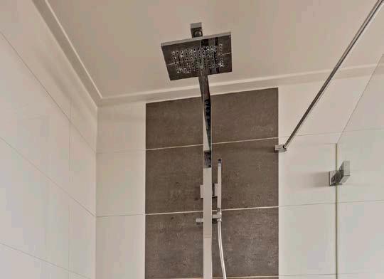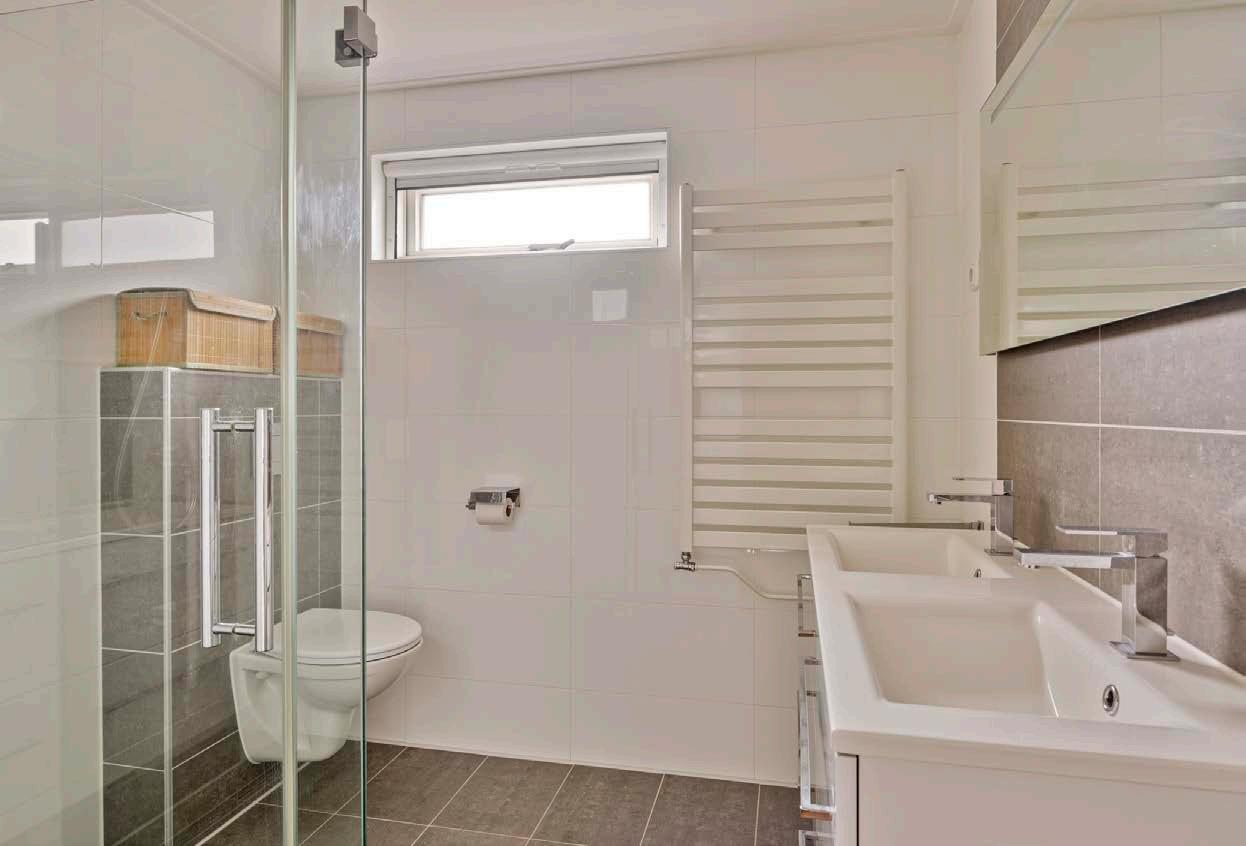 De luxe badkamer is modern en functioneel, met een ruime inloopdouche, toilet en spiegel met dubbele wastafel met meubel voor dagelijks comfort.