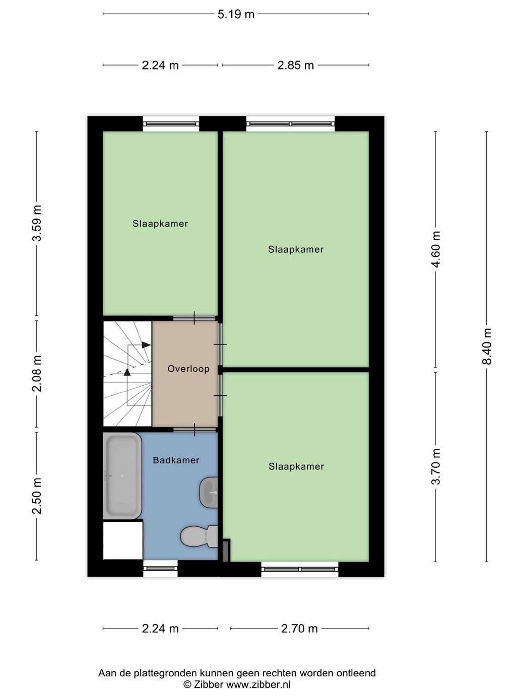 De eerste verdieping huisvest drie slaapkamers en een volledig betegelde badkamer met bad, wastafel en toilet. De tweede verdieping is via een vaste trap bereikbaar en biedt nog twee slaapkamers en de opstelling van de cv-installatie.