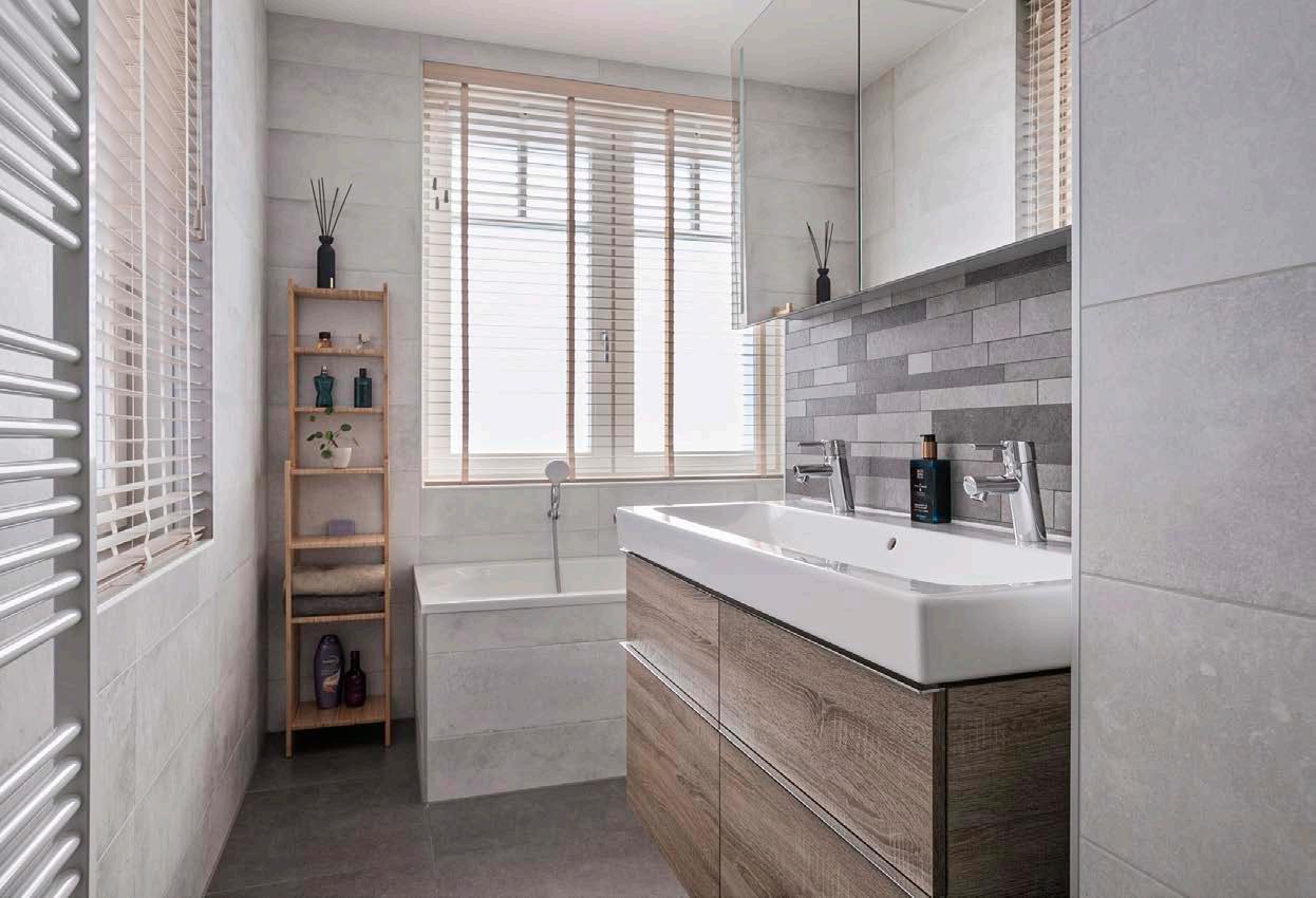 Na een lange dag kun je heerlijk ontspannen in het ligbad, terwijl het dubbele wastafelmeubel zorgt voor voldoende ruimte voor het hele gezin. De inloopdouche is modern en ruim, en het melkglas biedt de nodige privacy zonder het natuurlijke licht te blokkeren. Het aparte toilet op de eerste verdieping is een praktische aanvulling, zodat je nooit hoeft te wachten. Deze badkamer combineert functionaliteit met luxe, perfect voor dagelijks comfort.