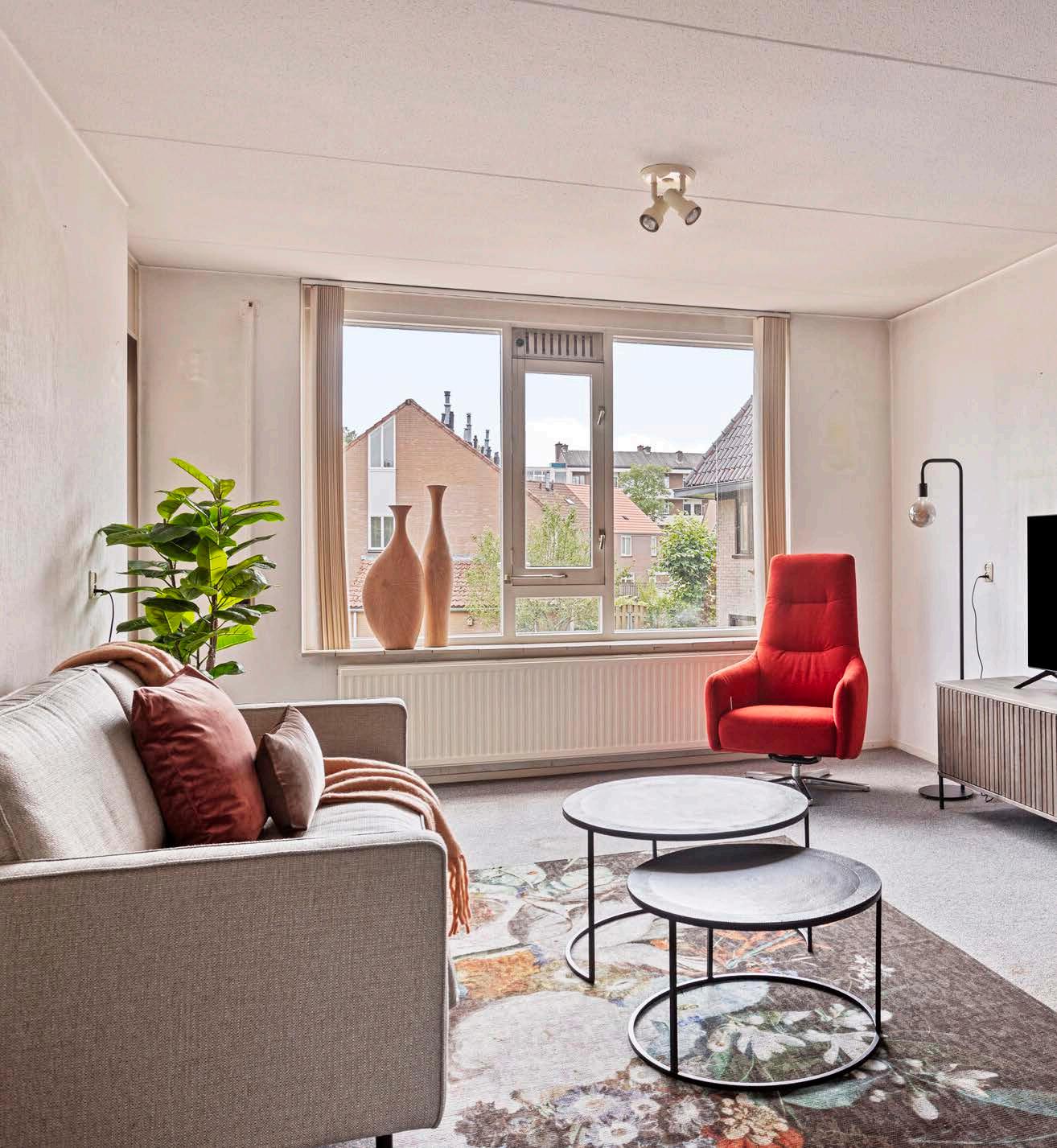 De royale woonkamer is het hart van dit appartement. Dankzij de grote raampartijen komt er veel natuurlijk licht binnen, wat de ruimte warm en uitnodigend maakt. Hier heb je alle ruimte om een comfortabele zithoek in te richten en eventueel een eetgedeelte te creëren. De open indeling zorgt ervoor dat je de ruimte naar eigen smaak kunt inrichten en optimaal kunt benutten. Of je nu een avondje ontspant op de bank, vrienden over de vloer hebt of een gezellige filmavond organiseert; deze royale woonkamer biedt alle mogelijkheden voor een fijn en comfortabel thuis.