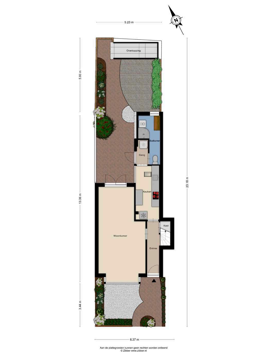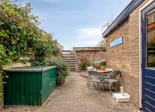 De diepe achtertuin biedt volop ruimte voor een terras, groen en een zitplek. Achterin de tuin bevindt zich een overkapping die gebruikt kan worden voor opslag. Een fijne buitenruimte met voldoende privacy.