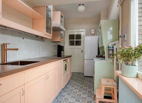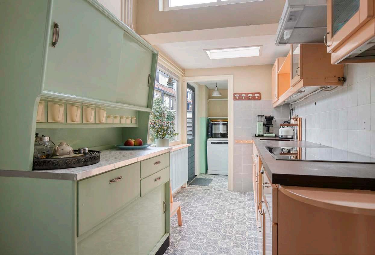 De keuken is praktisch ingericht en biedt voldoende werk- en kastruimte. Dankzij de efficiënte opstelling en aanwezige inbouwapparatuur is het een fijne plek om dagelijks te koken. Via de achterdeur loop je zo de tuin in, wat zorgt voor extra gemak.