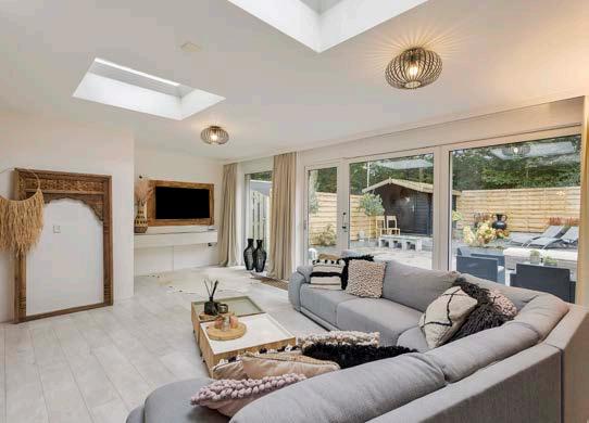 Wanneer je de uitgebouwde woonkamer binnen stapt, valt direct op hoe enorm veel leefruimte je hier hebt! Ook opvallend is de prettige inval van het daglicht via de schuifpui aan de achterzijde en het tweetal lichtkoepels. Het geheel is daarnaast ook zeer smaakvol afgewerkt met laminaat op de vloer en strak stucwerk in lichte kleuren op de wanden. In de woonkamer is tevens een handige provisiekast aanwezig.