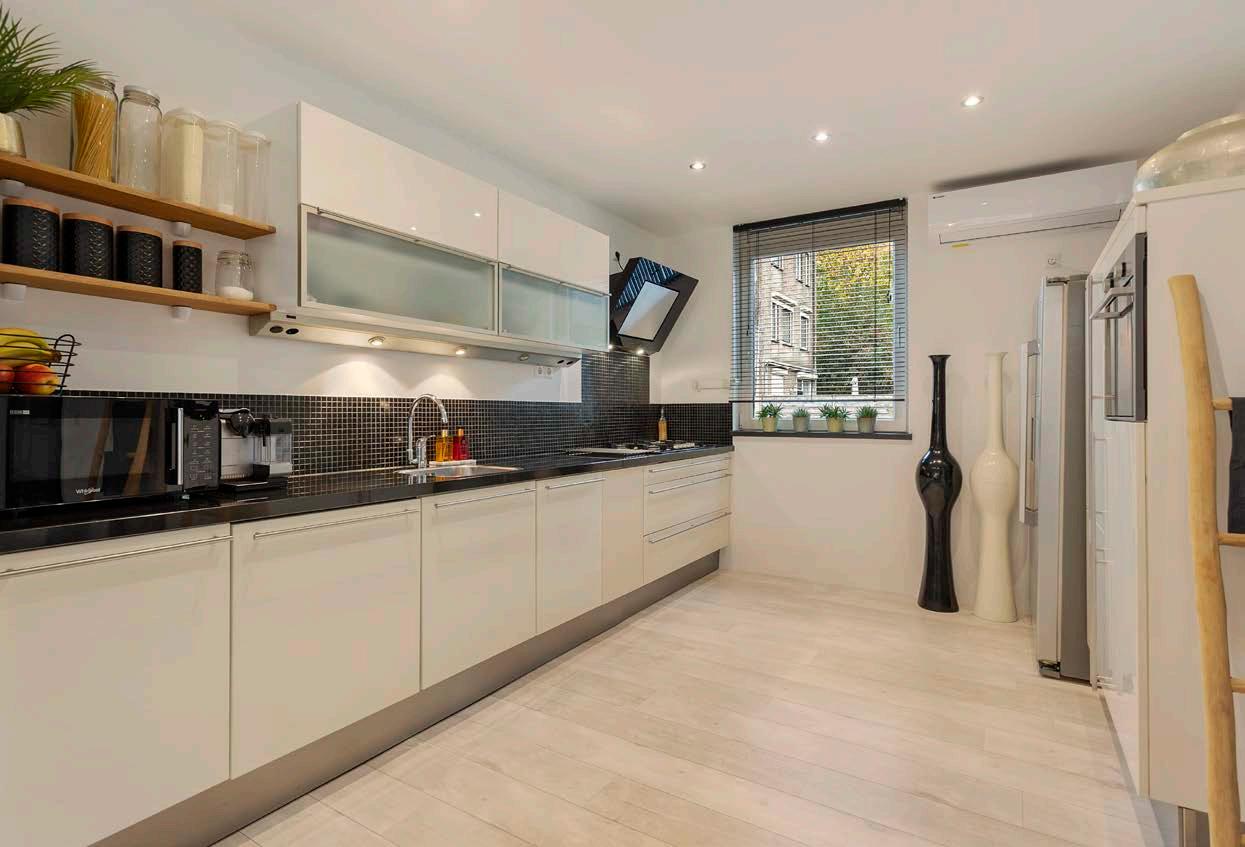 Deze eethoek sluit vervolgens weer naadloos aan op de luxe en modern uitgevoerde open keuken (Siematic). De keuken is geplaatst in een lange wandopstelling met nog een aantal hoge kasten aan de andere zijde. In de keuken, met granieten werkblad, beschik je over voldoende kast- en wer kruimte en daarnaast ben je hier voorzien van een 5-pits gaskookplaat, afzuigkap, vaatwasser, combioven en een koelkast.