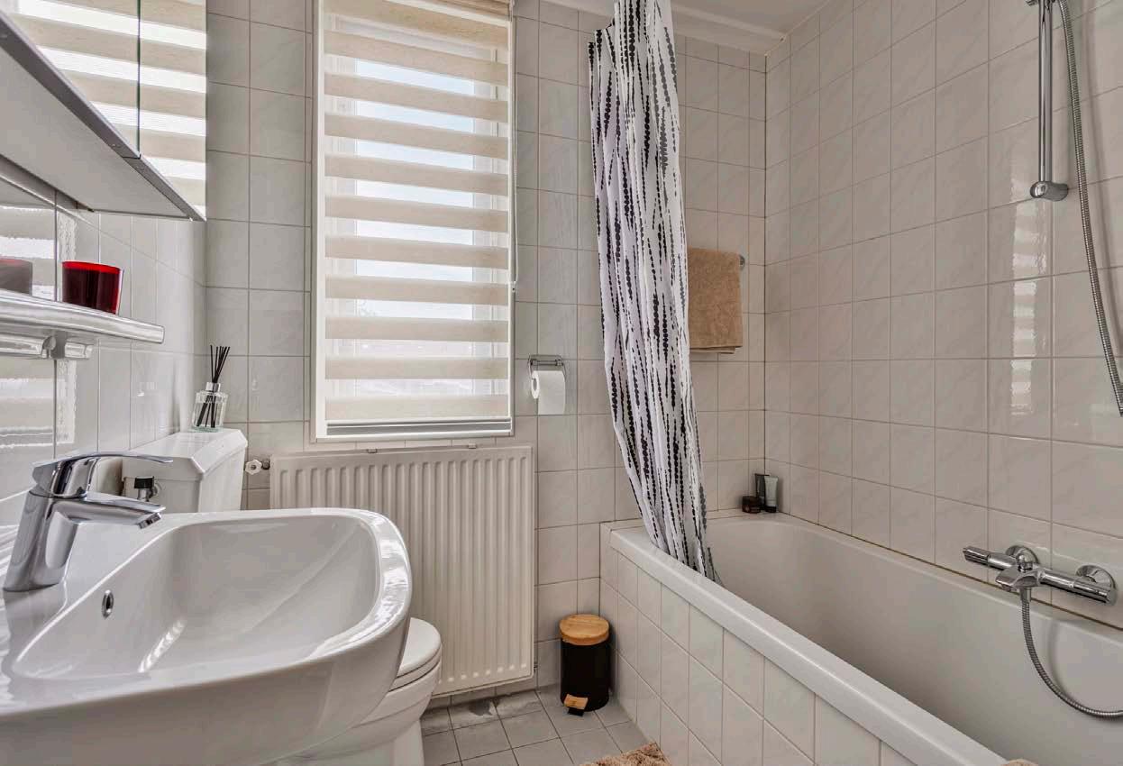 De badkamer is functioneel ingericht met een bad, toilet en wastafel, perfect voor de dagelijkse verzorging.