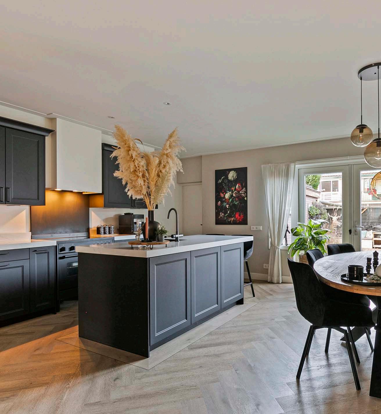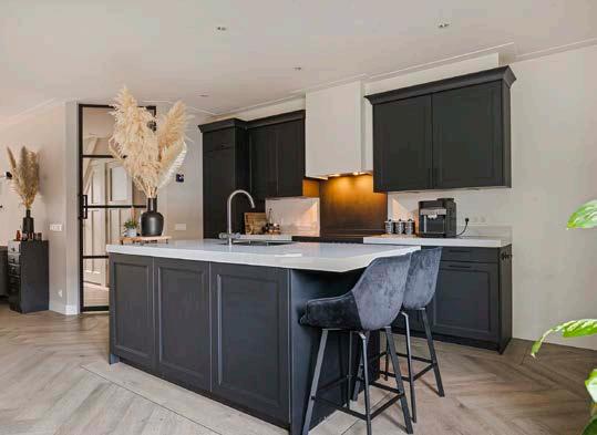 De keuken is van alle gemakken voorzien en beschikt over inbouwapparatuur zoals een 5-pits inductiekookplaat, oven, koelkast, vriezer, vaatwasser, en Quooker. Het kookeiland biedt extra werkruimte en maakt de keuken tot een fijne plek om te koken en samen te komen.