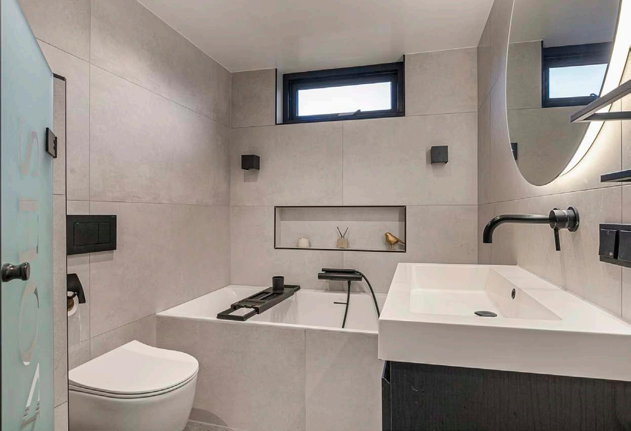 De badkamer is modern en praktisch ingericht met een inloopdouche, ligbad, wastafelmeubel en toilet. Een fijne plek om de dag te beginnen of te eindigen, met alles wat je nodig hebt binnen handbereik.