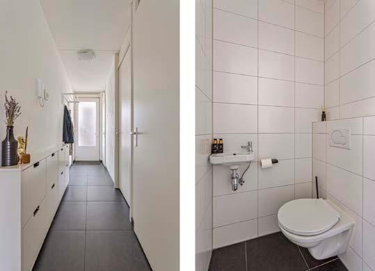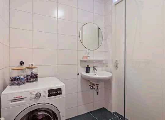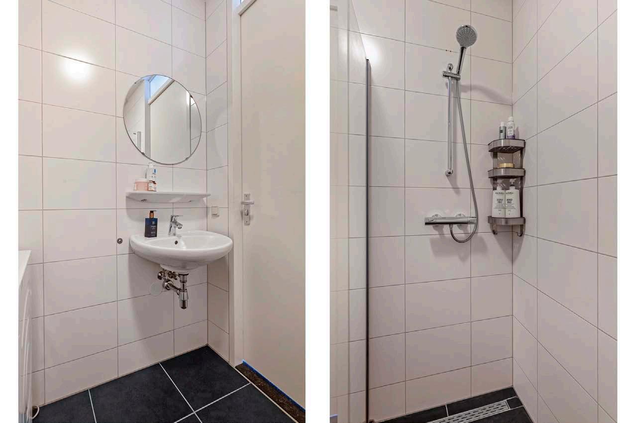 De slaapkamer heeft directe toegang tot de ruime badkamer met inloopdouche, wastafel en witgoedaansluitingen. Het aparte toilet is voorzien van een hangtoilet en fontein.