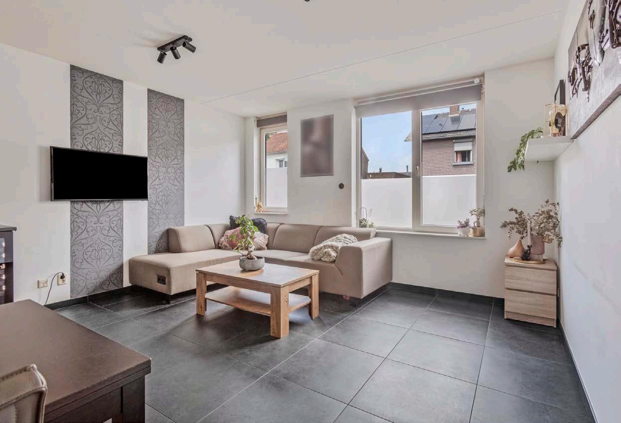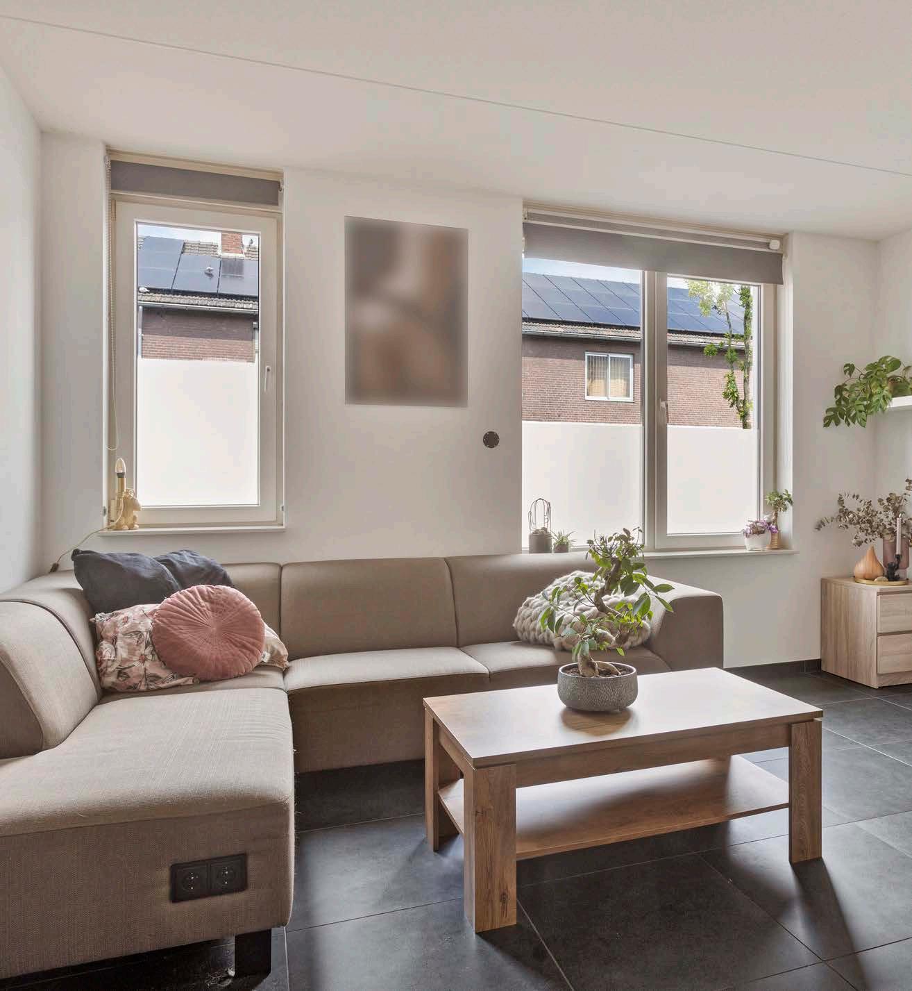 Het appartement is voorzien van een prachtige donkere tegelvloer met vloerverwarming en strak afgewerkte wanden en plafonds. Daarnaast beschikt de woonkamer over grote raampartijen, die zorgen voor veel lichtinval.