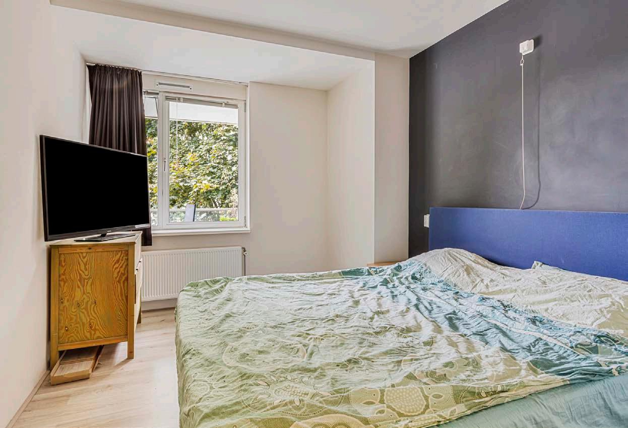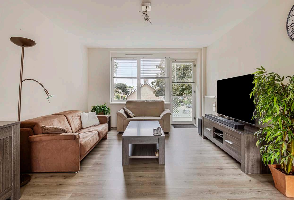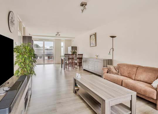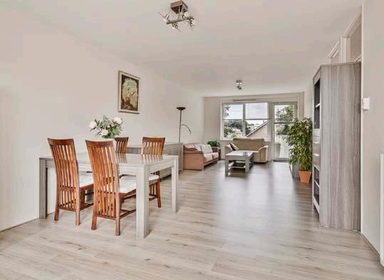 De woonkamer is een van de blikvangers van dit appartement. De grote raampartijen in zowel de voor- als achtergevel zorgen voor een overvloed aan natuurlijk licht, waardoor de ruimte fris en uitnodigend aanvoelt. De woonkamer is netjes afgewerkt, met een mooie laminaatvloer en strak gestuukte wanden, en biedt voldoende ruimte voor een comfortabele zithoek en een eettafel.