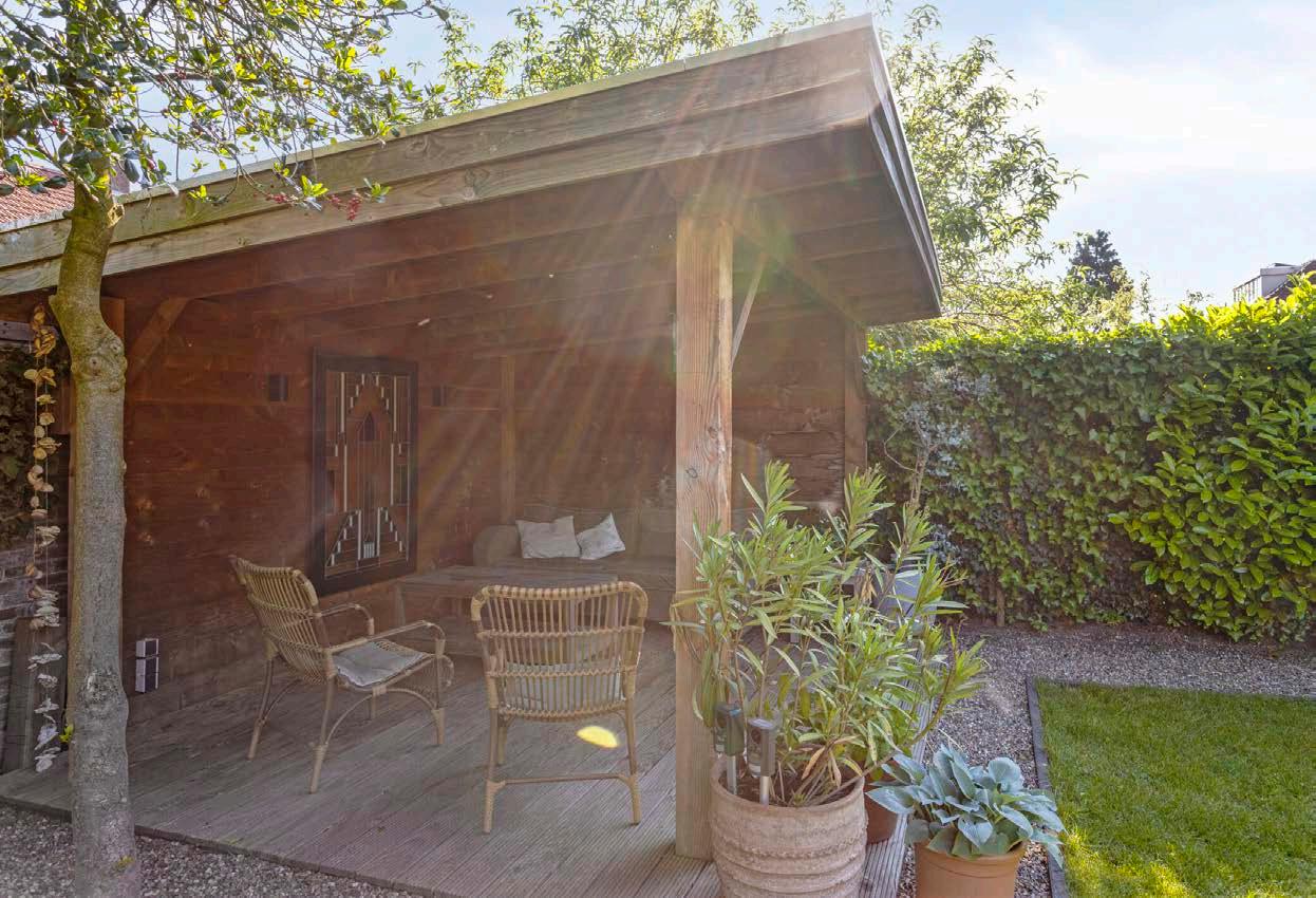 De berging in de tuin heeft openslaande deuren die uitkijken op de tuin. Het biedt voldoende ruimte voor het opbergen van tuingereedschap en fietsen. Met de deuren open, creëert het een toegankelijke en praktische opslagoplossing.