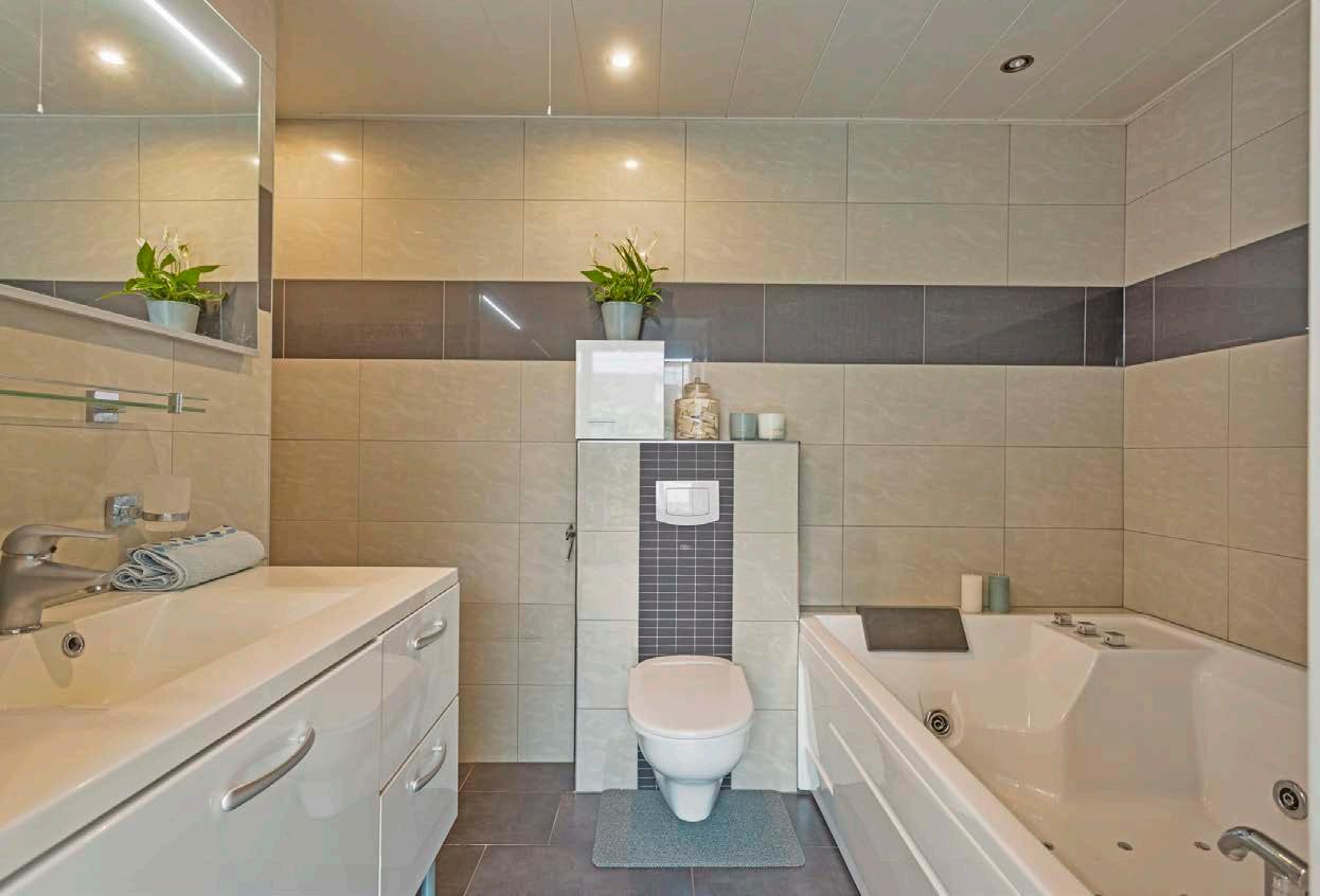 De badkamer op de begane grond is een absolute troef voor wie gelijkvloers wil wonen. De moderne inrichting, met een ruime douche, wastafelmeubel, toilet en een ligbad zorgt voor optimaal comfort.