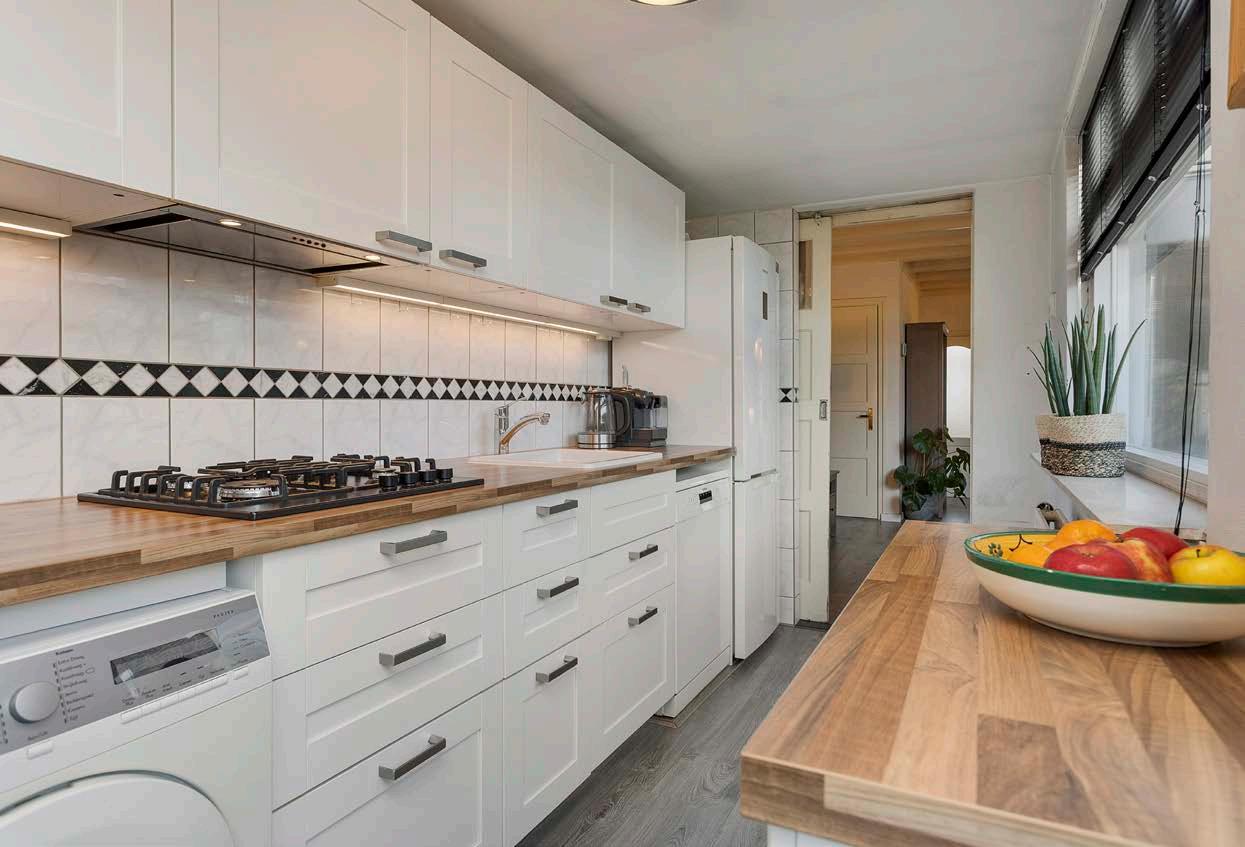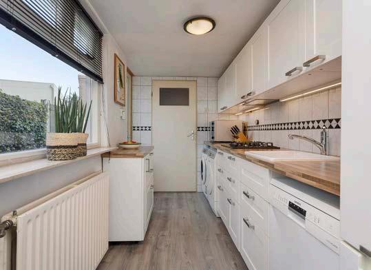 Vanuit de woonkamer lopen we door naar de moderne keuken. De compacte keuken is geplaatst in een praktische wandopstelling en heeft veel lichtinval. De keuken is voorzien van diverse (inbouw)apparatuur, zoals een 4-pits gaskookplaat, afzuigkap en een losse vaatwasser. Ook vind je hier de aansluitingen voor de wasapparatuur. Vanuit de keuken stap je bovendien zo de zonnige achtertuin in!