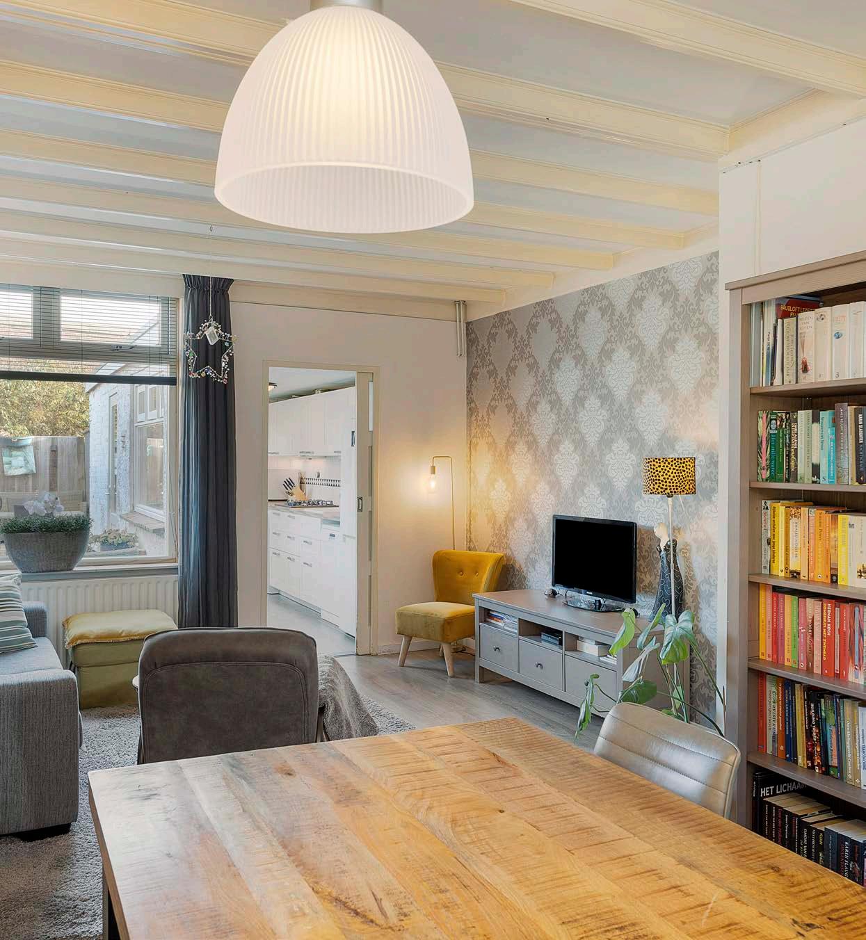 De woonkamer is verrassend ruim en bovenal heerlijk licht dankzij de ramen aan twee zijden. Je hebt hier volop ruimte voor een knusse zithoek en een gezellige eethoek. De woonkamer is afgewerkt met een laminaatvloer en strak gestucte wanden in een lichte kleurstelling. Vanuit de woonkamer met sfeervolle open haard heb je uitzicht op de tuin.