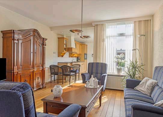 Verder is de ruimte keurig netjes afgewerkt met lichte wanden en een houten vloer. Hoewel de stijl misschien wat gedateerd is, zorgt het toch voor een gezellige en huiselijke uitstraling. Bovendien biedt de woonkamer voldoende daglicht dankzij de grote raampartijen aan beide kanten van de kamer.