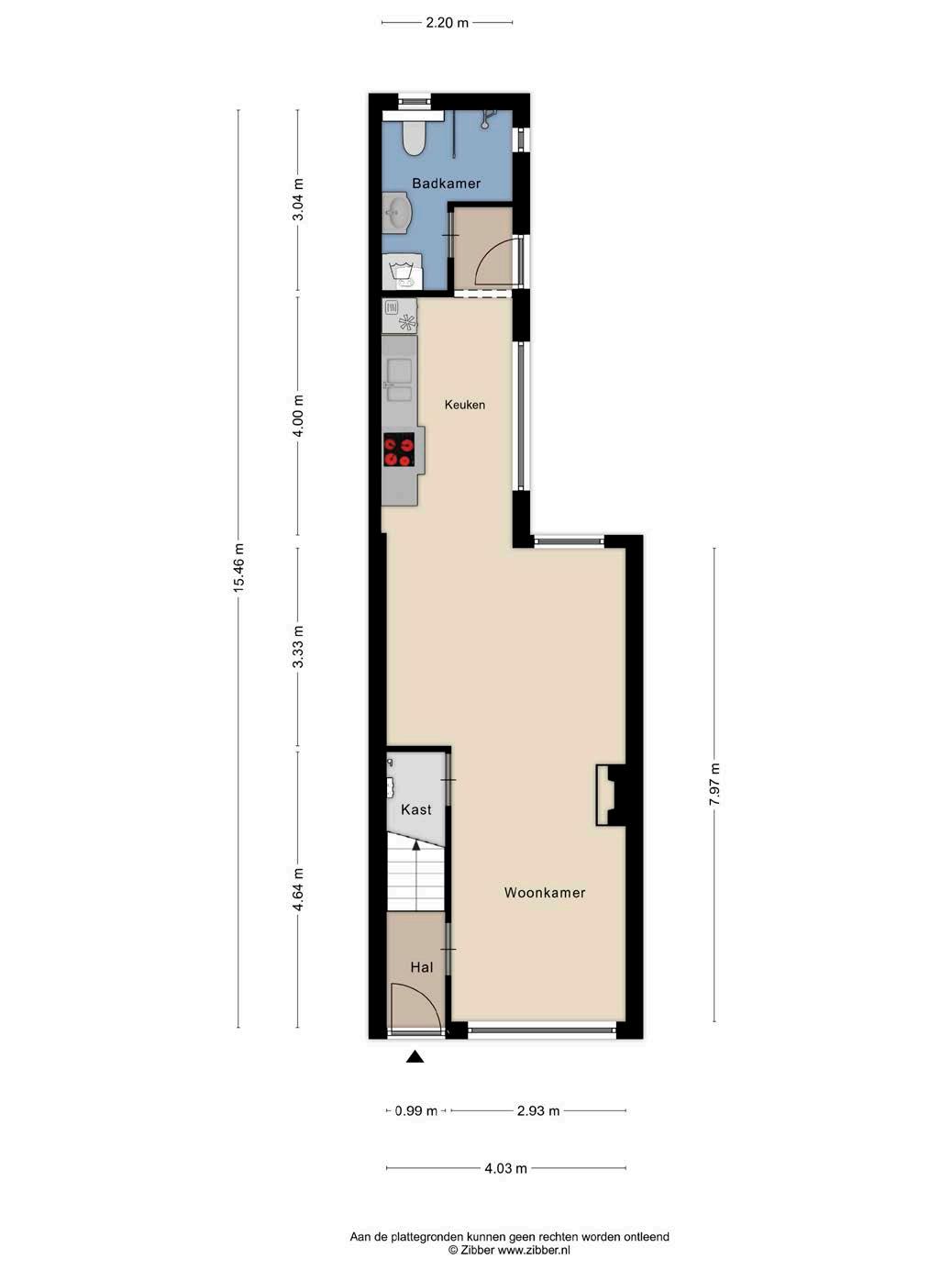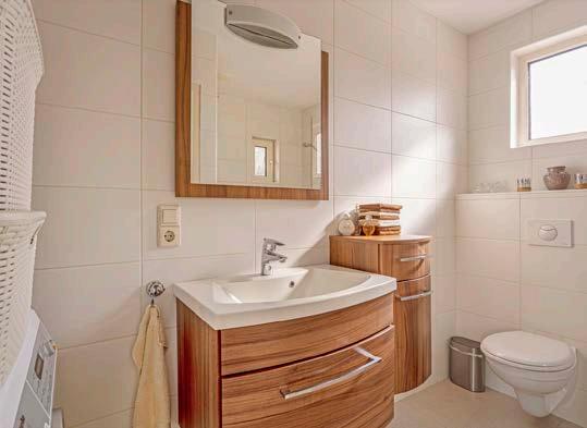 Via de keuken kom je in de badkamer die eveneens op de begane grond is gesitueerd. De ruimte is van grond tot plafond betegeld en heeft een verzorgde uitstraling. De indeling bestaat uit een wastafelmeubel, douche, toilet en de wasmachineaansluiting.