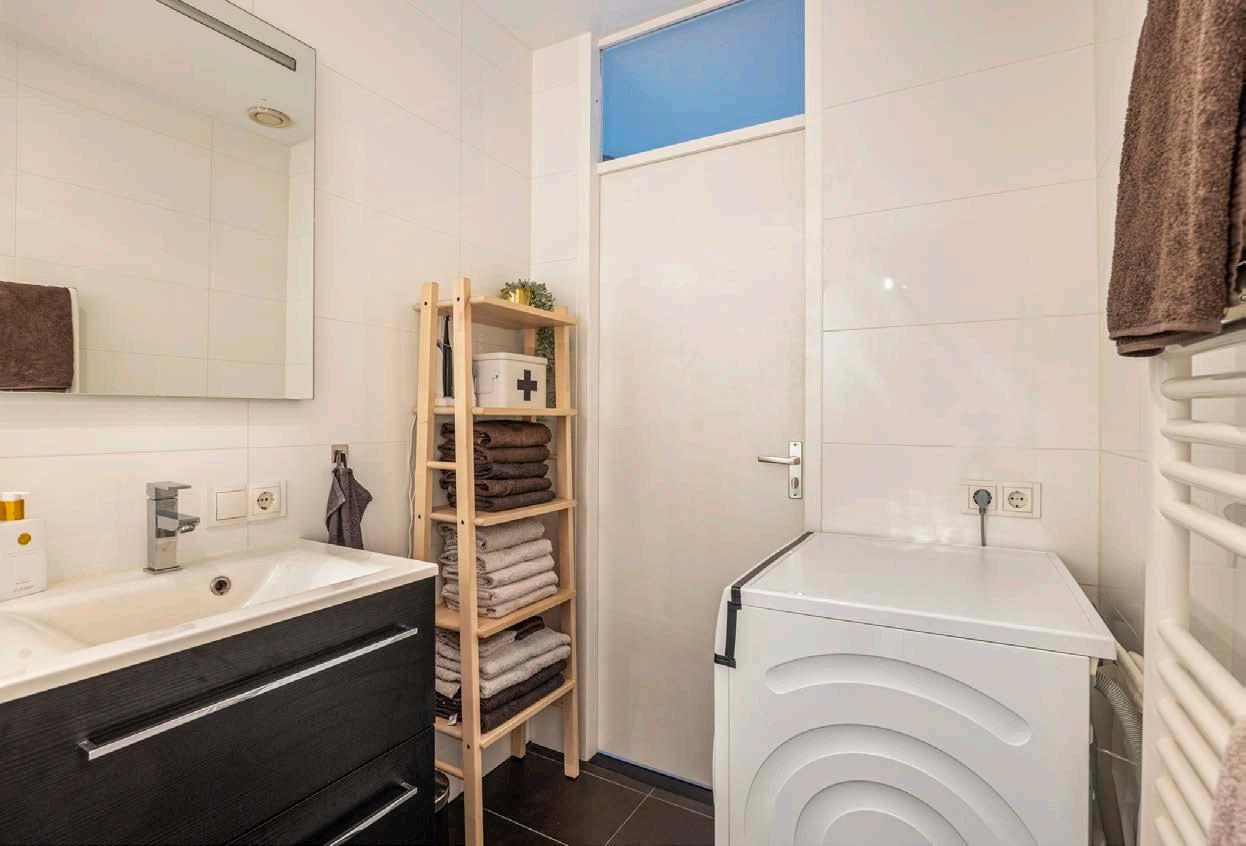 Keurige badkamer met inloopdouche, modern wastafelmeubel, design radiator en wasmachineaansluiting.