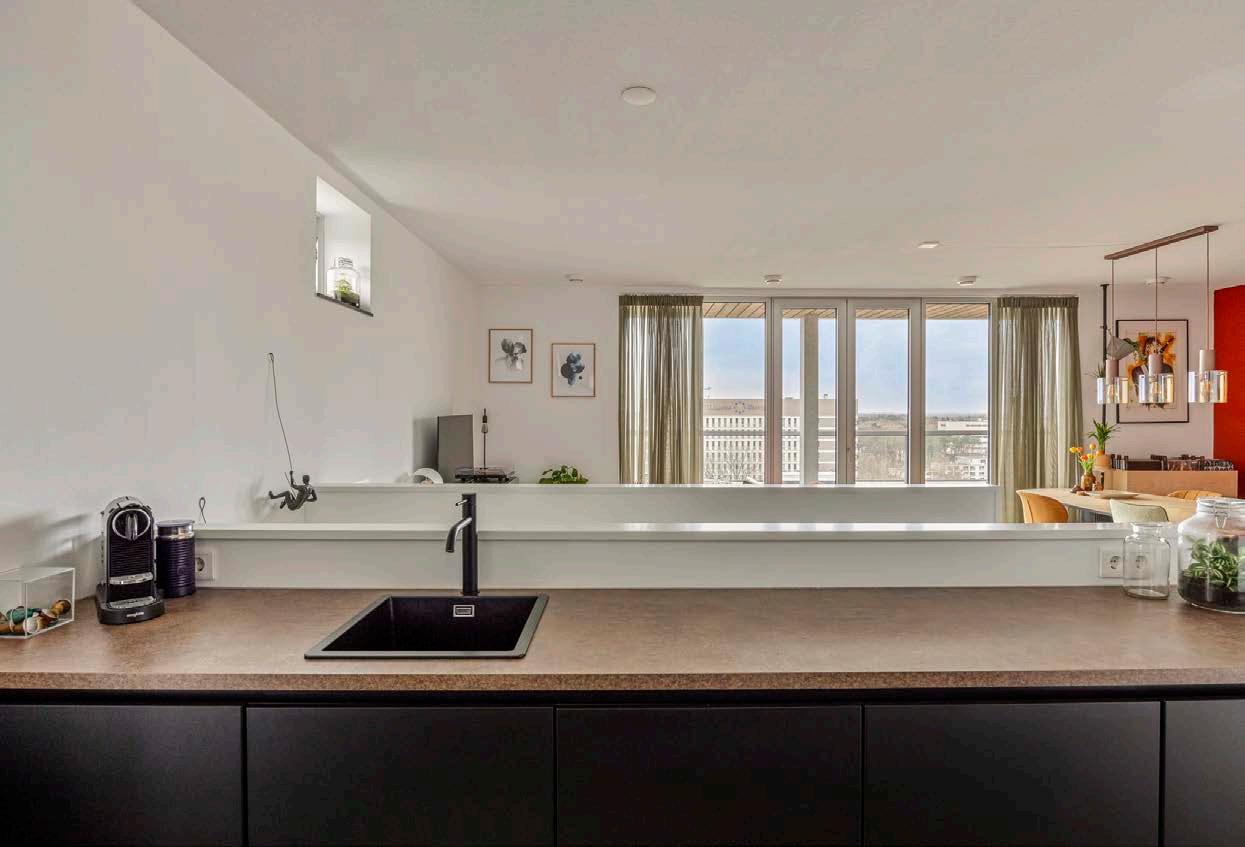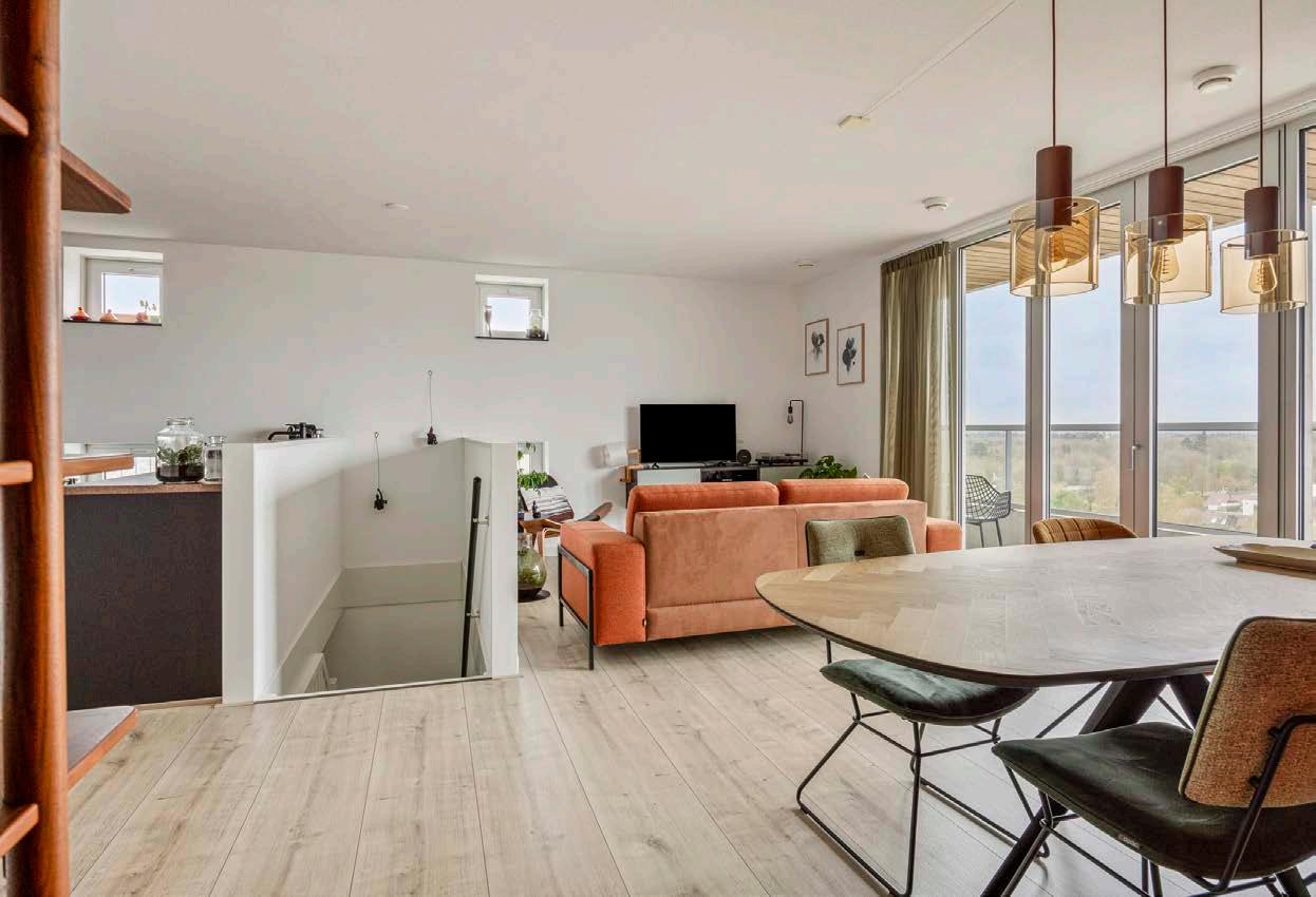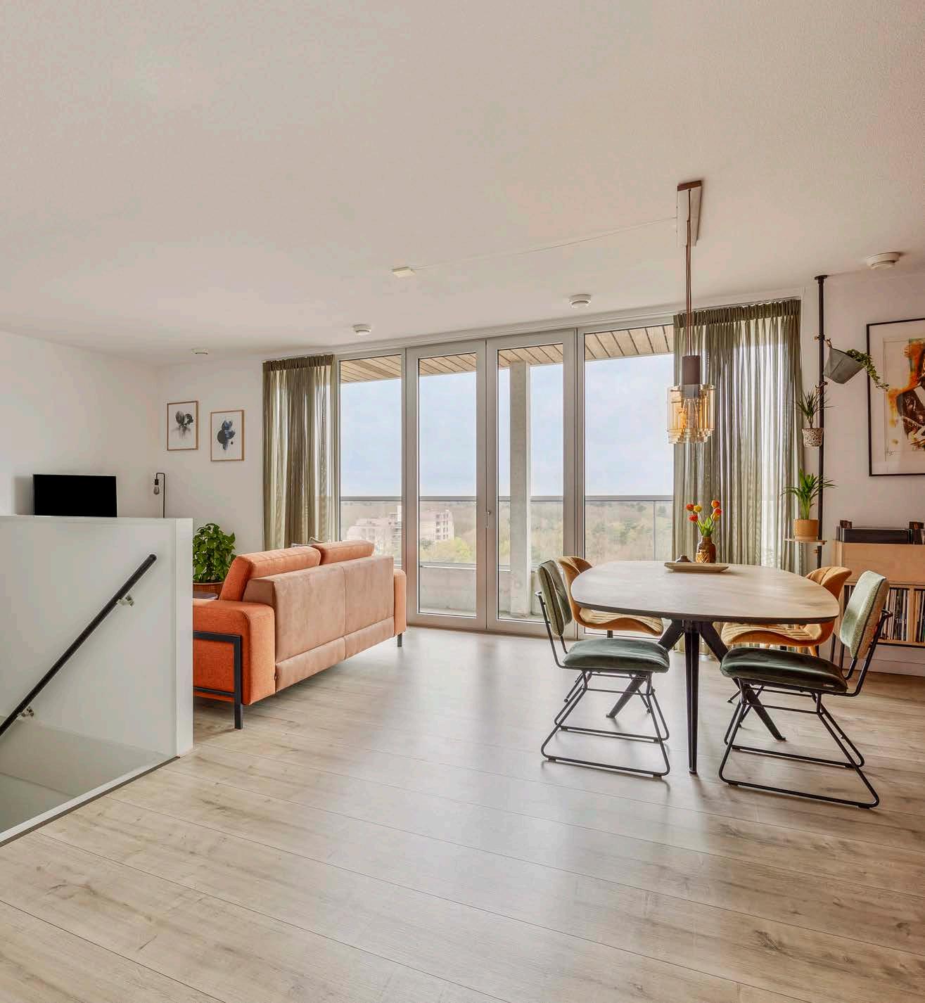 Zodra u de drempel van dit appartement overstapt, wordt u verwelkomd door de royale woonkamer, waar het daglicht vrij spel heeft. De grote raampartijen en speelse zijramen creëren een levendig schouwspel van licht en schaduw, wat de ruimte een open en uitnodigend karakter geeft.