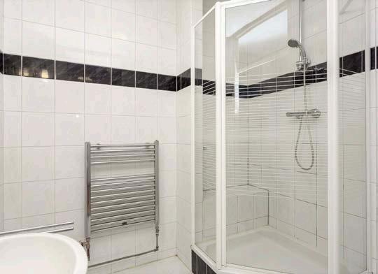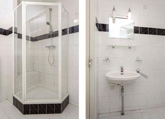 De prima badkamer is van grond tot aan plafond betegeld en uitgerust met een wastafel en een douchecabine. Vanuit de gang komt u bij het separate toilet met fontein.