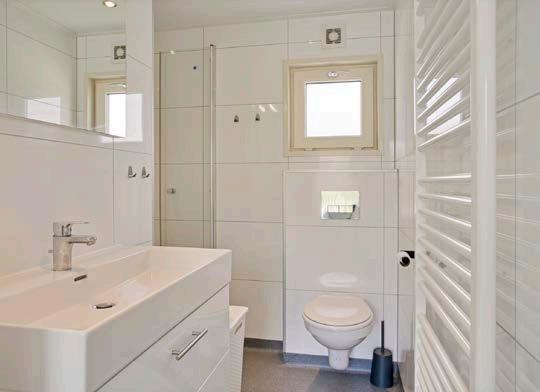 De moderne badkamer is uitgerust met een groot wastafelmeubel, inloopdouche, designradiator en hangend toilet. Ook is er mechanische ventilatie aanwezig.