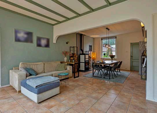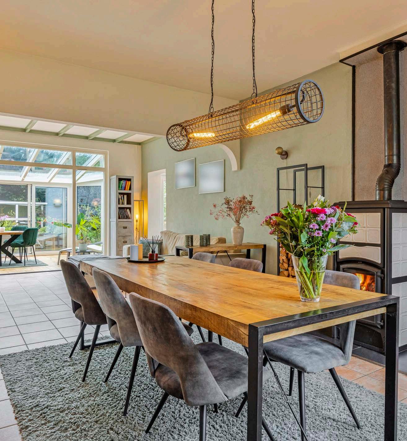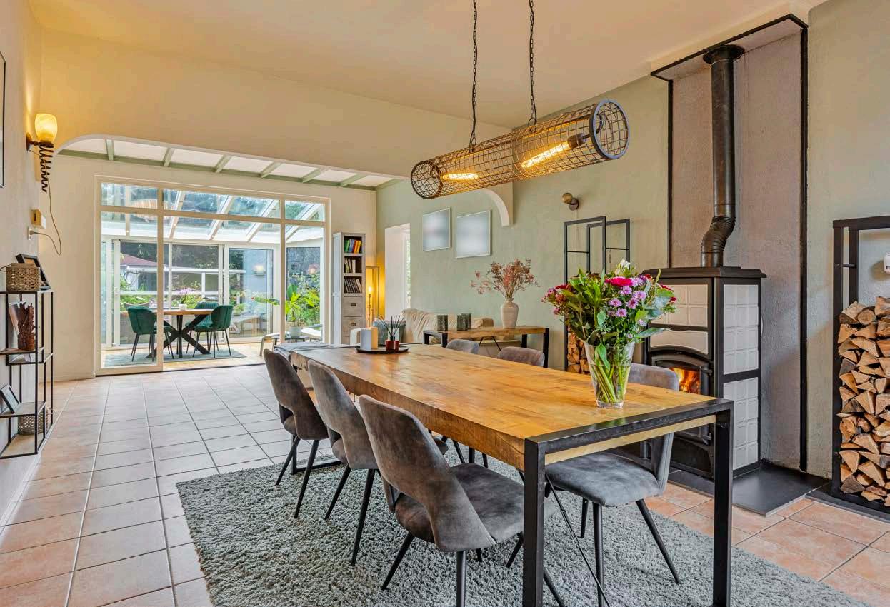 Deze woonkamer ademt gezelligheid en warmte. De houtkachel zorgt niet alleen voor een aangename temperatuur, maar ook voor een knusse sfeer. De ruimte is ruim opgezet, waardoor er voldoende plek is voor een grote zithoek en een gezellige eethoek. De grote ramen laten veel natuurlijk licht binnen, wat de kamer nog uitnodigender maakt. Hier voel je je direct thuis, vooral op koude winteravonden als het haardvuur knispert en de geur van brandend hout zich verspreidt.
