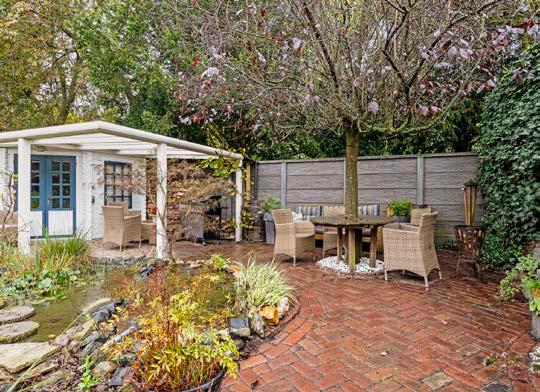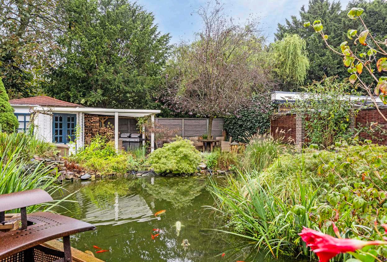 De tuin zelf is een waar paradijs. Fraai aangelegd met diverse terrassen, een grote vijverpartij en een houten tuinhuis met overkapping, biedt de tuin een perfecte mix van zon en schaduw, ideale plekken om te ontspannen of te entertainen. Of je nu een barbecue organiseert, een boek leest in de schaduw van de bomen, of gewoon geniet van de rust en stilte, deze tuin heeft het allemaal.