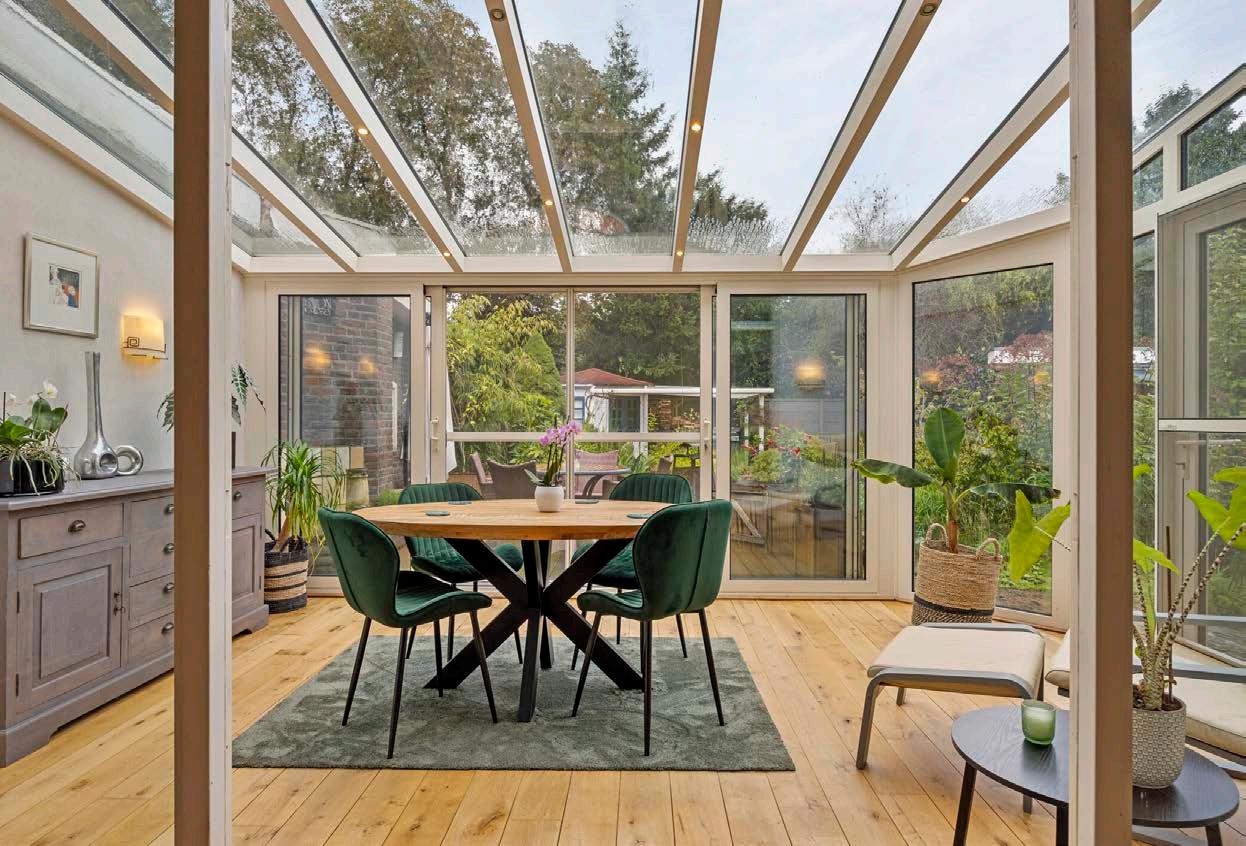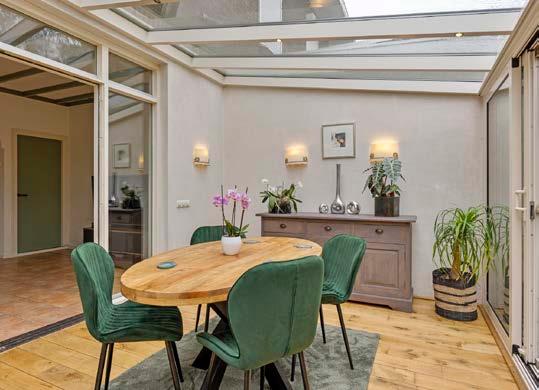 De serre is een oase van licht en rust. Met grote ramen die een panoramisch uitzicht bieden op de tuin, is dit de perfecte plek om te ontspannen met een boek of om te genieten van een kop koffie in de ochtendzon. De serre is ruim genoeg voor een comfortabele eethoek, waardoor het een multifunctionele ruimte is die het hele jaar door gebruikt kan worden. Hier voel je je één met de natuur, ongeacht het seizoen.