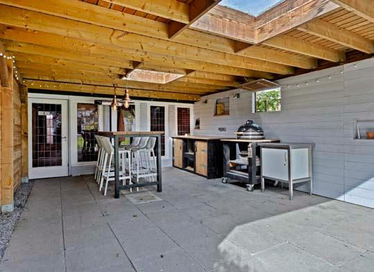De royale aanbouw aan de achterzijde herbergt een woonkeuken / eetkamer die het hart van het huis vormt. Met een indrukwekkend kookeiland, uitgerust met een 5-pits gaskookplaat en afzuigkap, en een stijlvolle indeling met dubbele aanrechtruimte, wordt koken hier een waar genot. Tegenover het eiland is er een hoge kast met de koelvriescombinatie, combi-oven en een gewone oven en een laag gedeelte met o.a. de spoelbak. De bijkeuken biedt extra functionaliteit met aansluitingen voor wasapparatuur en een vaatwasser.