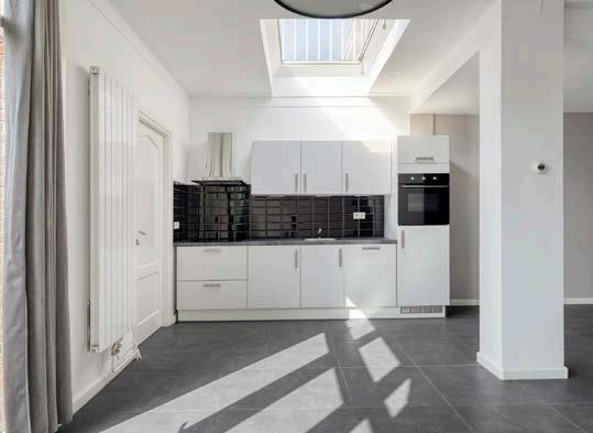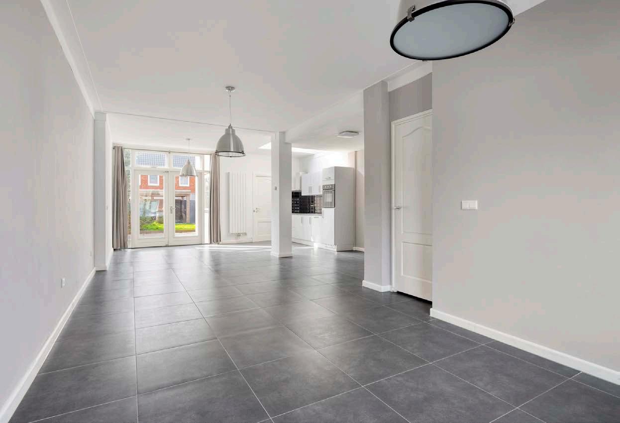 Het woon- en eetgedeelte is strak gestuukt met moderne wanden en plafonds, gecombineerd met een tijdloze, onderhoudsvriendelijke tegelvloer die luxe uitstraalt.