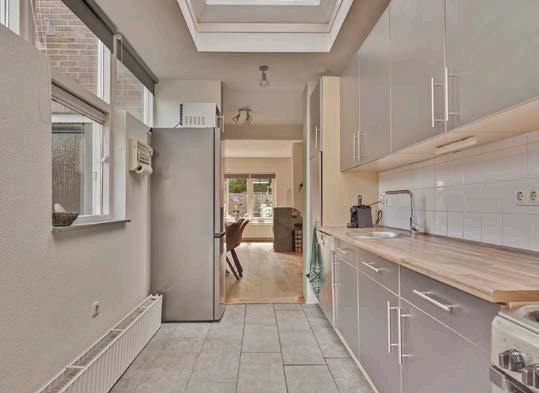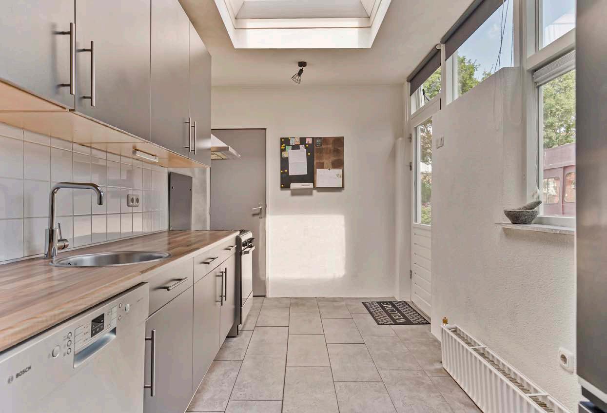 De keuken is voorzien van een vaatwasser en een afzuigkap. Vanuit de keuken heb je directe toegang tot de voortuin. De keuken is voorzien van twee lichtkoepels, wat zorgt voor meer lichtinval.