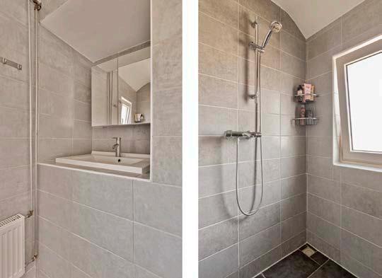 De badkamer is in 2020 volledig opnieuw betegeld en beschikt over een ruime inloopdouche en een elegante wastafel. Hier begin je je dag fris en ontspannen.