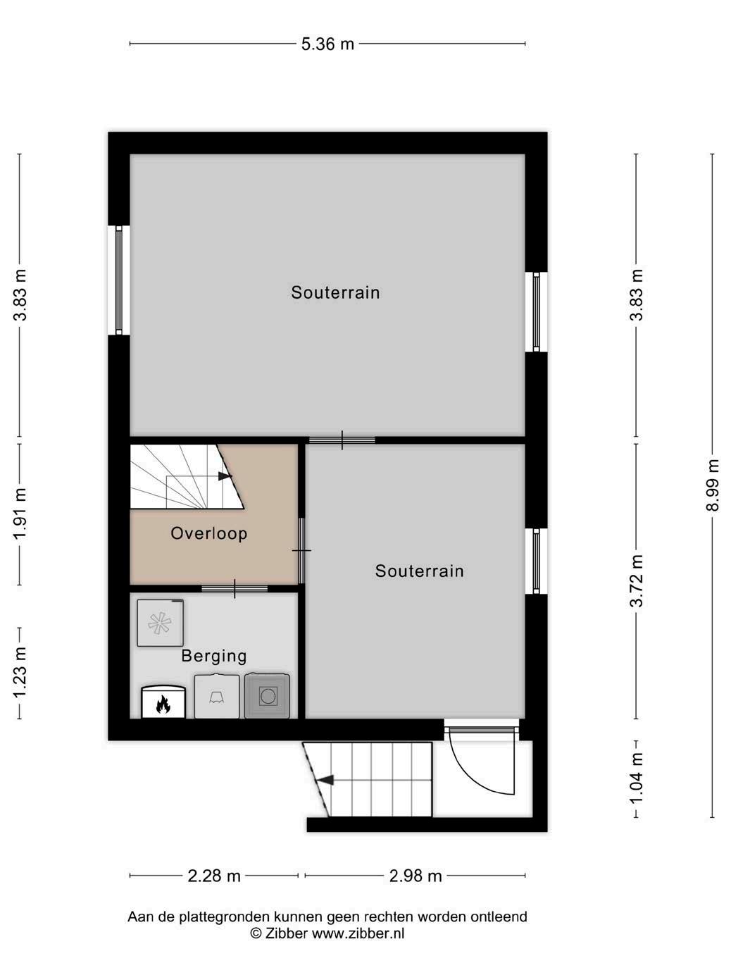 Vanuit de entree bereik je middels de trap het souterrain. Het souterrain geeft je de mogelijkheid om twee extra kamers of een werkruimte te creëren, wat zorgt voor extra flexibiliteit. Tevens is hier ook een berging gesitueerd waar de aansluiting van het witgoed en de cv ketel zich bevinden.
