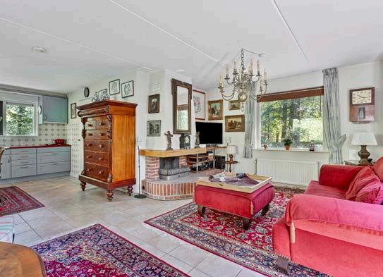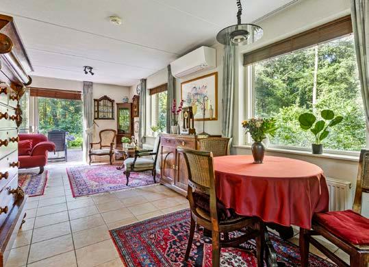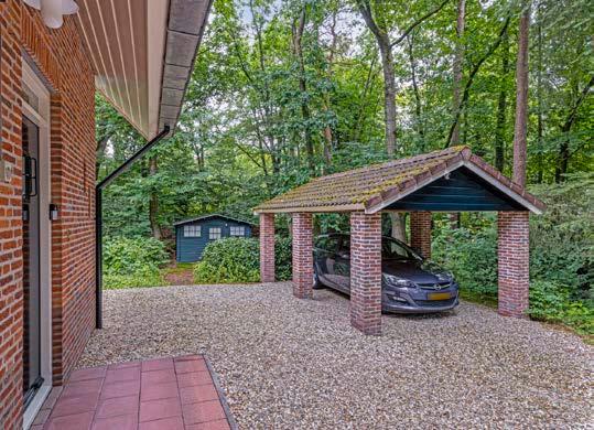 Verder is er veel parkeerruimte. Er is royale bergruimte beschikbaar in 1 tuinhuis van 10 m2 en 1 tuinhuis van 4,6 m2. Men heeft veel privacy en rust door de dichte begroeiing. Rond het huis staan, o.a. hazelnootstruiken, hoge dennen, beukjes, grote tamme kastanje bomen en eiken. Je komt hier in het vele groen tot rust op het terras met de zingende vogels om je heen. Het terras op het zuiden is voorzien van een 4 meter breed elektrisch zonnescherm.