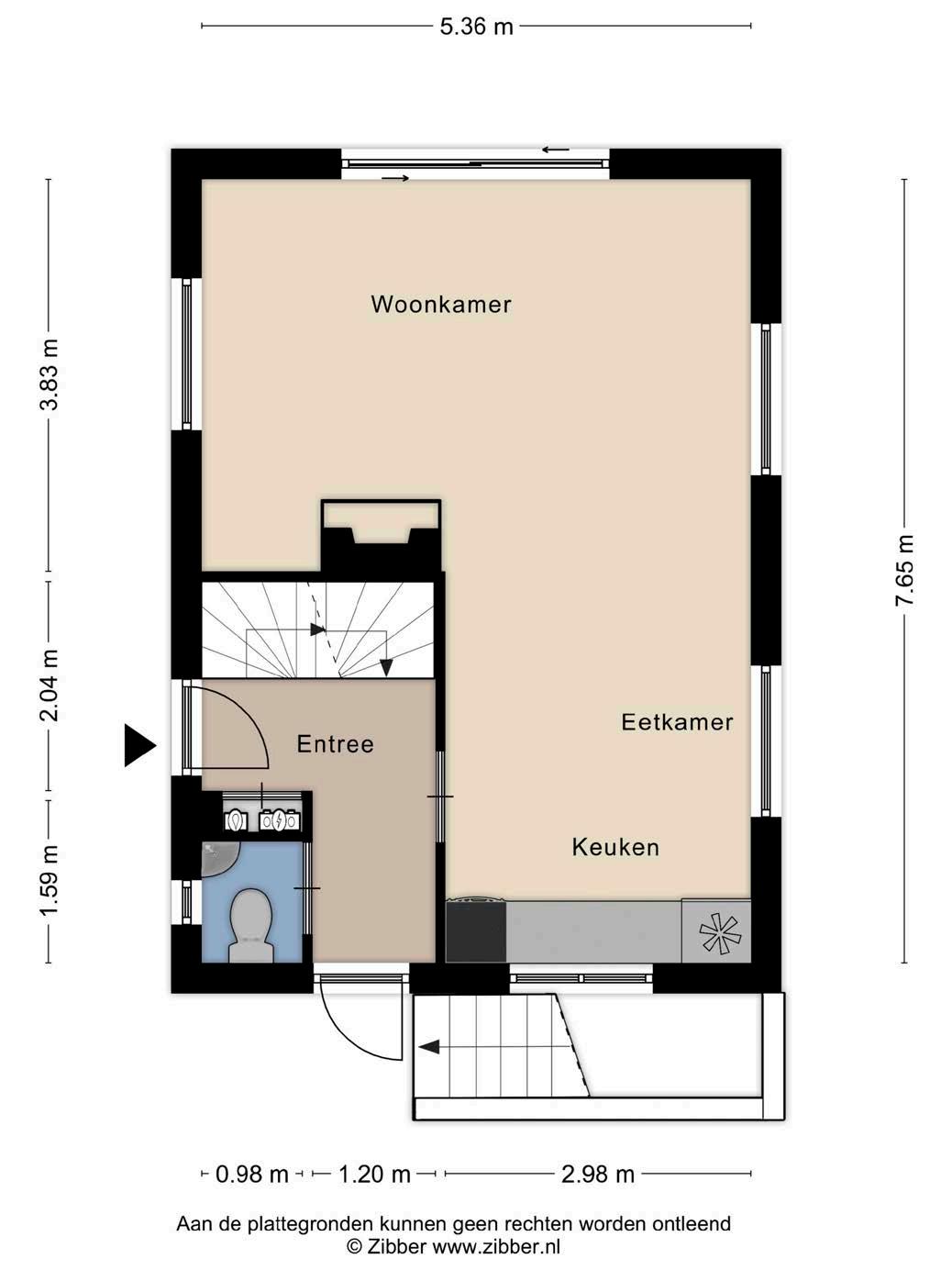 De entree is voorzien van een meterkast en toilet. De toiletruimte is volledig betegeld en voorzien van een fonteintje. Vanuit de entree bereik je de doorgang naar de leefruimte, welke je brengt naar de keuken en de woonkamer.