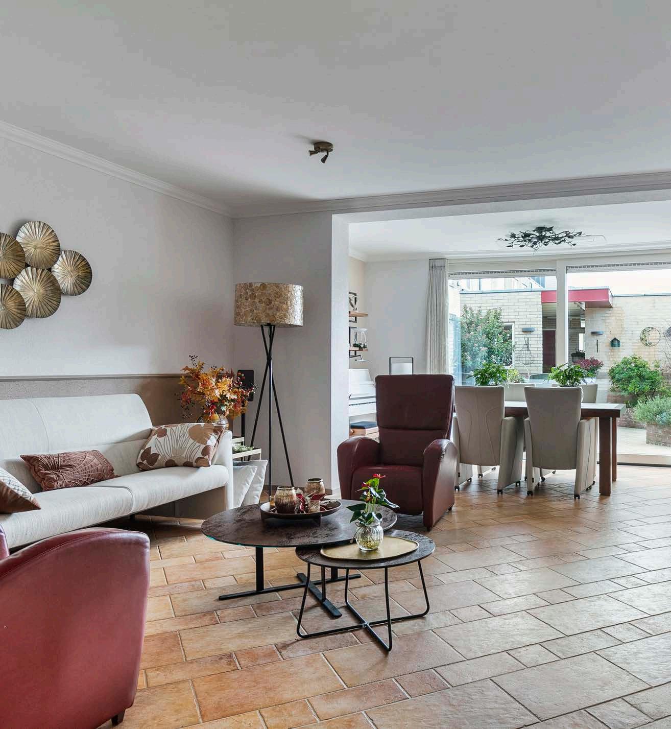 De woonkamer biedt een uitnodigende en ruime leefomgeving, perfect voor gezellige avonden met het gezin of ontspanning na een lange dag. Door de uitbouw ontstaat er extra ruimte, waardoor je flexibel bent in de indeling van je interieur. De plavuizen vloer met vloerverwarming zorgt voor een aangename temperatuur het hele jaar door, terwijl de grote ramen veel natuurlijk licht binnenlaten.