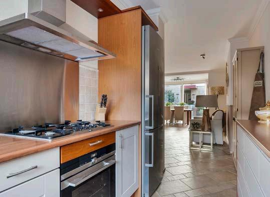 Deze keuken is uitgerust met een 5-pits gaskookplaat, oven, afzuigkap en vernieuwde koel-vriescombinatie en vaatwasser. De plavuizen vloer met vloerverwarming zorgt voor extra comfort tijdens het koken. De keuken is praktisch ingedeeld, waardoor je efficiënt kunt werken en er voldoende opbergruimte is voor al je keukengerei. Door de indeling blijf je in contact met je gasten of het gezin.