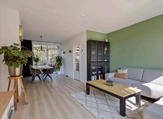 De woonkamer is een licht en ruim doorzonvertrek. Dankzij de schuifpui aan de voorzijde stroomt het daglicht rijkelijk naar binnen, wat de ruimte heerlijk licht maakt. De eethoek aan de voorzijde heeft directe toegang tot het inpandige balkon, waar je gezellig kunt ontbijten met uitzicht op het omringende groen. Aan de achterzijde bevindt zich de zithoek, waar een loopdeur toegang biedt tot een tweede balkon, eveneens voorzien van siergrind.