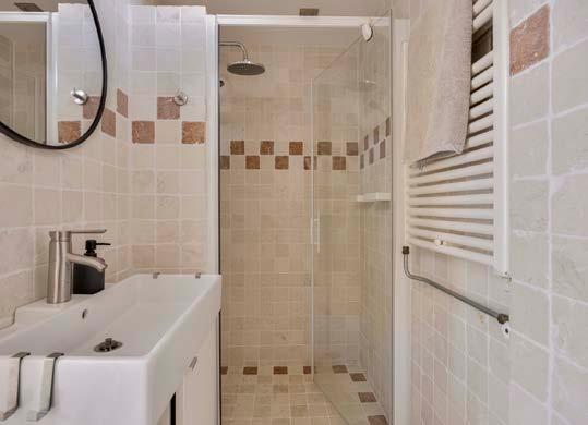 Via de keuken bereik je de badkamer. De volledig betegelde ruimte met getrommeld marmer straalt elegantie uit. Hier kun je genieten van een verkwikkende douche onder de regendouchekop, of kiezen voor de gewone douchekop. De badkamer is verder uitgerust met een wastafel in meubel, wandkast en designradiator – alles wat je nodig hebt voor een ontspannen start van de dag.